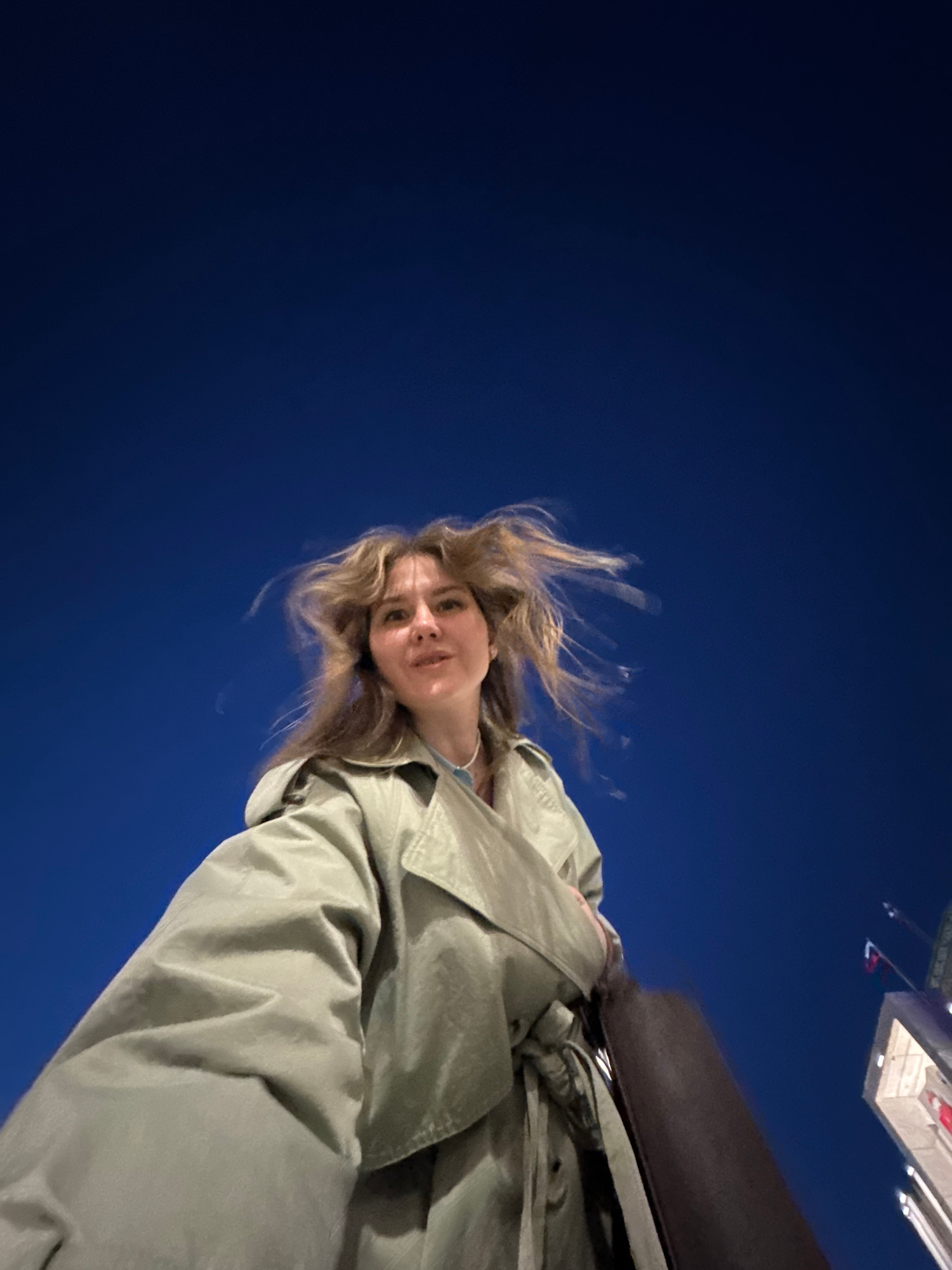 A low-angle portrait shot of a light-skinned female with light brown hair, wearing a light green belted coat, presumably in Perm, Russia. In the upper portion of the image, a building in the distance…read more