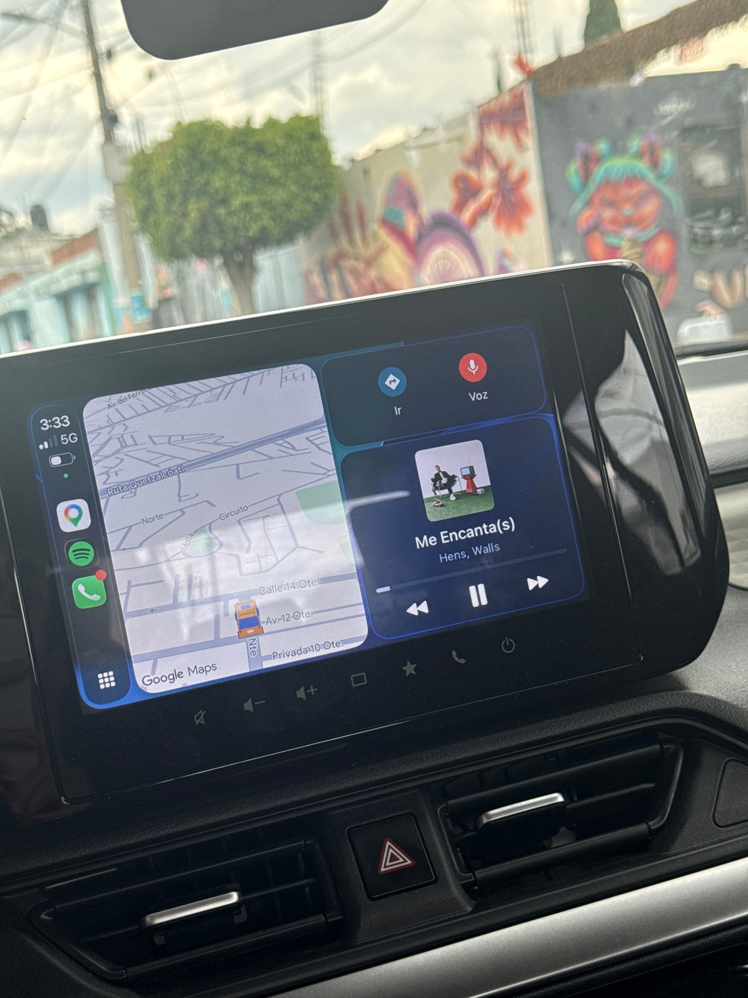 The image shows a car infotainment system displaying Google Maps with a route in San Andrés Cholula, Mexico. The navigation shows the vehicle positioned on Avenida 12 Oriente near Calle 14 Oriente, he…read more