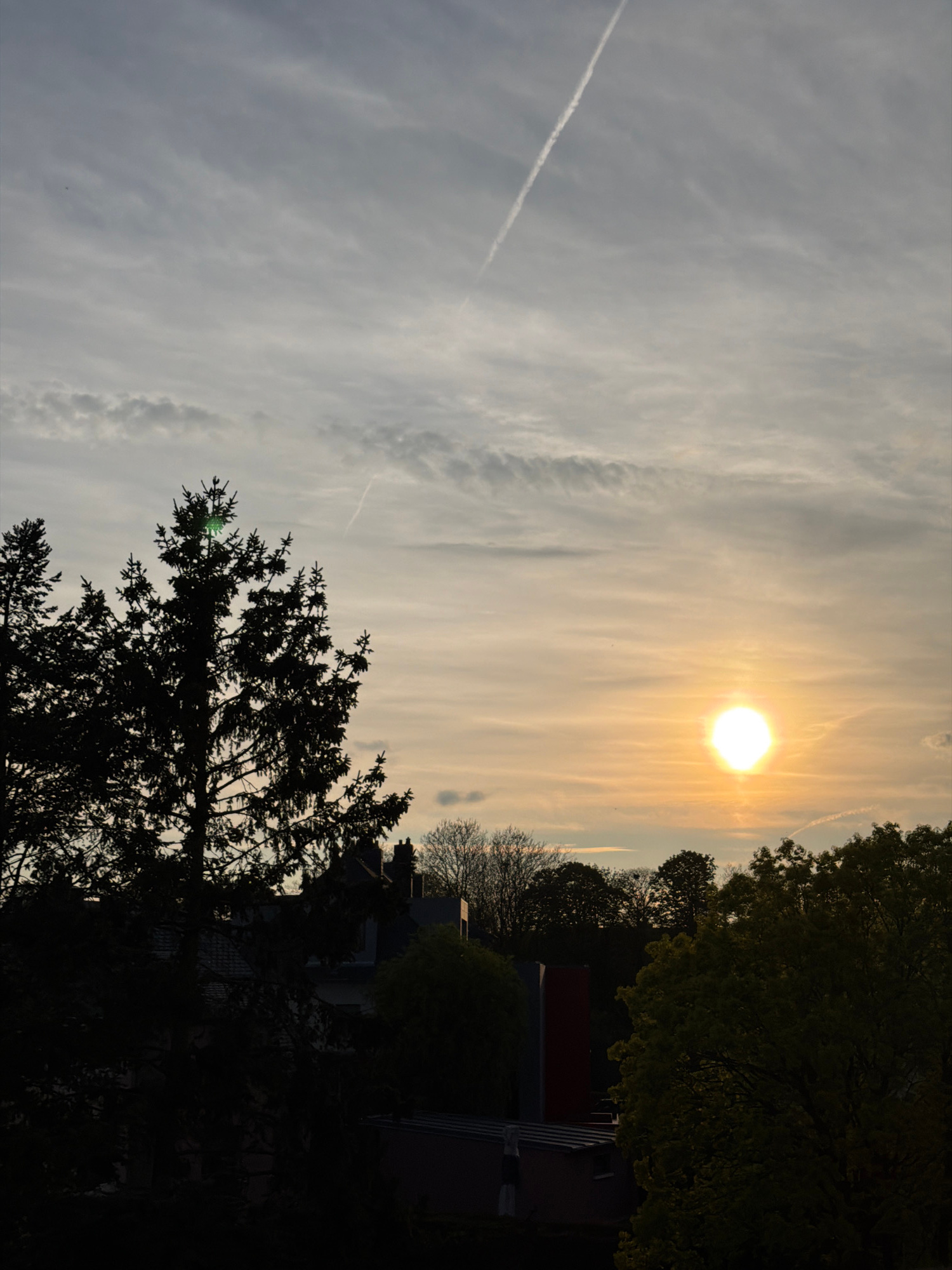 The image captures a sunset scene in Esch-sur-Alzette, Luxembourg. The sun, a bright orb, is positioned in the upper right quadrant of the image, partially obscured by thin, wispy clouds. The sky is f…read more