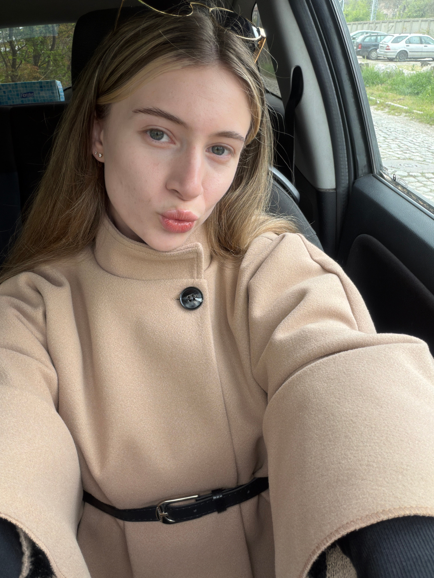 A selfie taken inside a car. The subject, a young woman with light skin and light brown hair with blonde highlights, is wearing a light beige coat with a black belt. She is looking at the camera with…read more