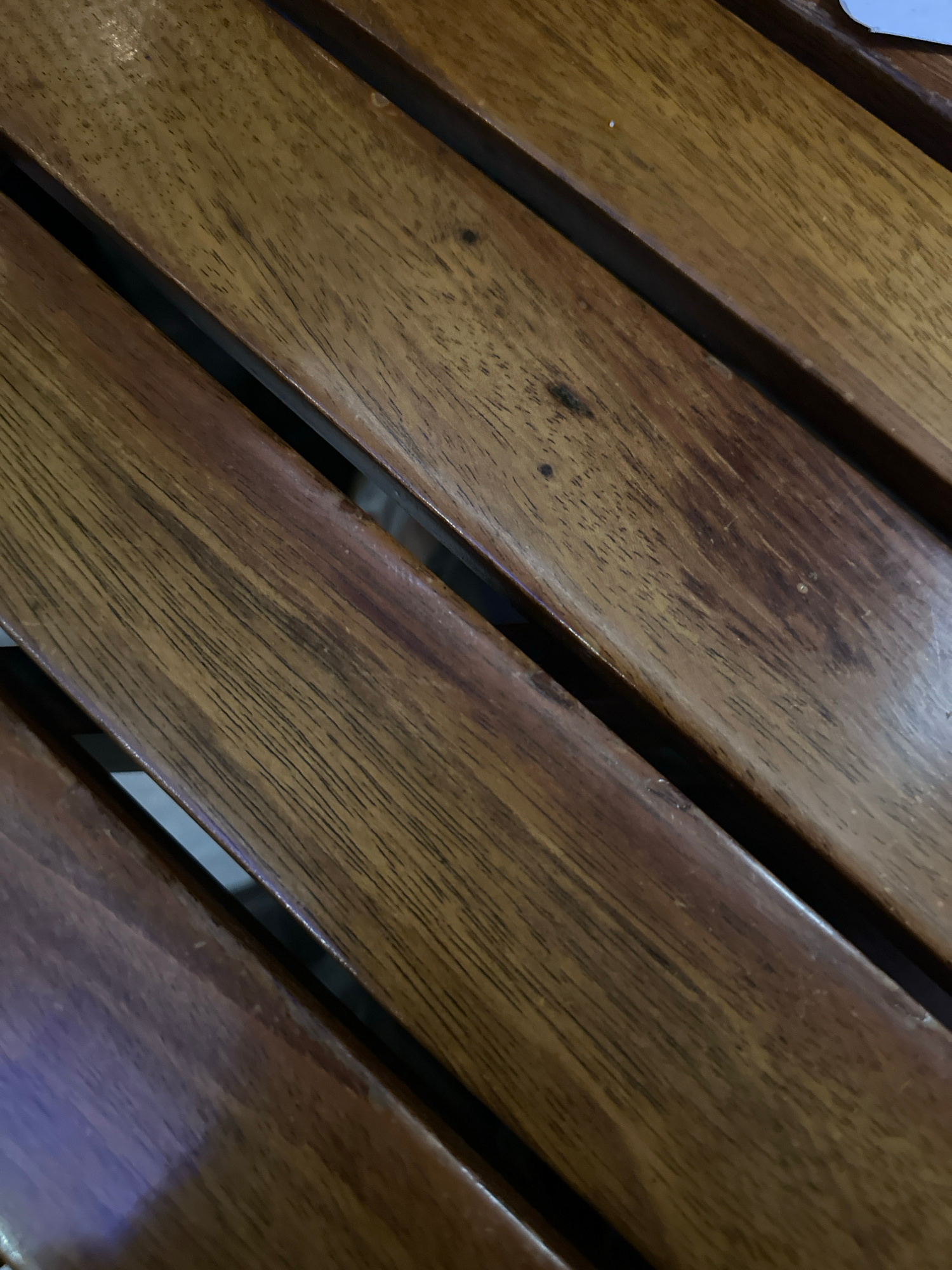 The image shows a close-up view of multiple parallel wooden slats. They are likely part of a bench or chair, displaying a varnished or polished finish. The wood grain is clearly visible. The location…read more
