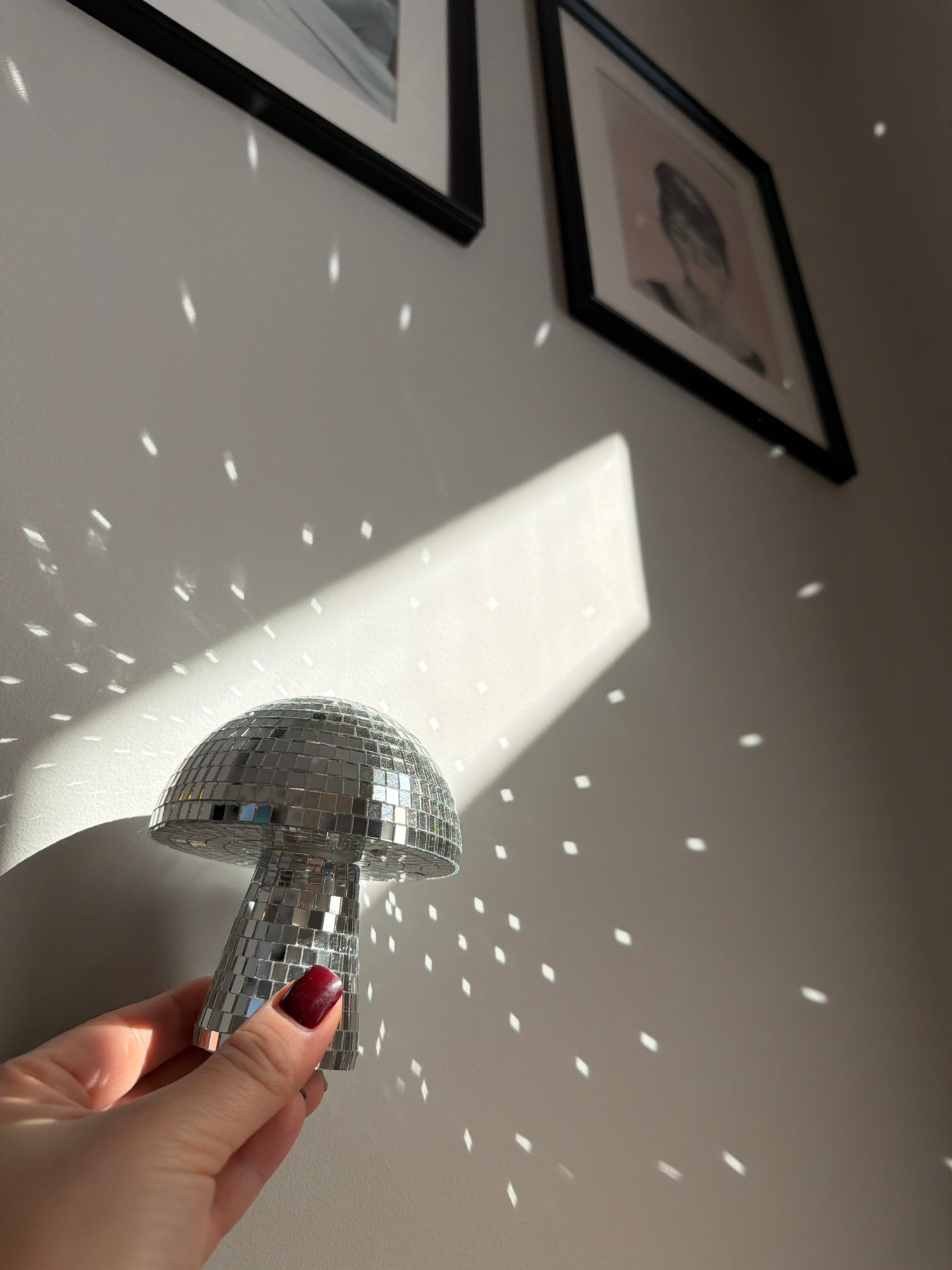 A woman's hand, with a visible burgundy manicure, holds a small disco ball against a white wall. The disco ball casts dappled light reflections across the wall. Two framed pictures hang on the wall to…read more