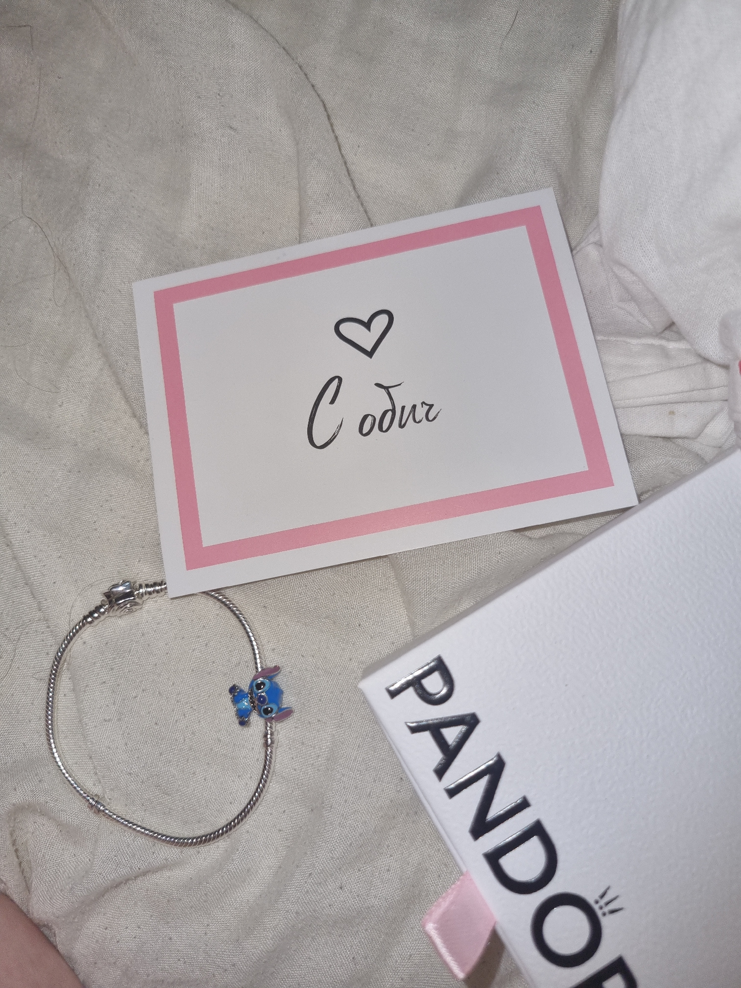 The image shows a white linen surface upon which a few objects are arranged. A pink-bordered white card with the phrase "Coeur" written on it is placed near a Pandora jewelry box. Adjacent to both of…read more