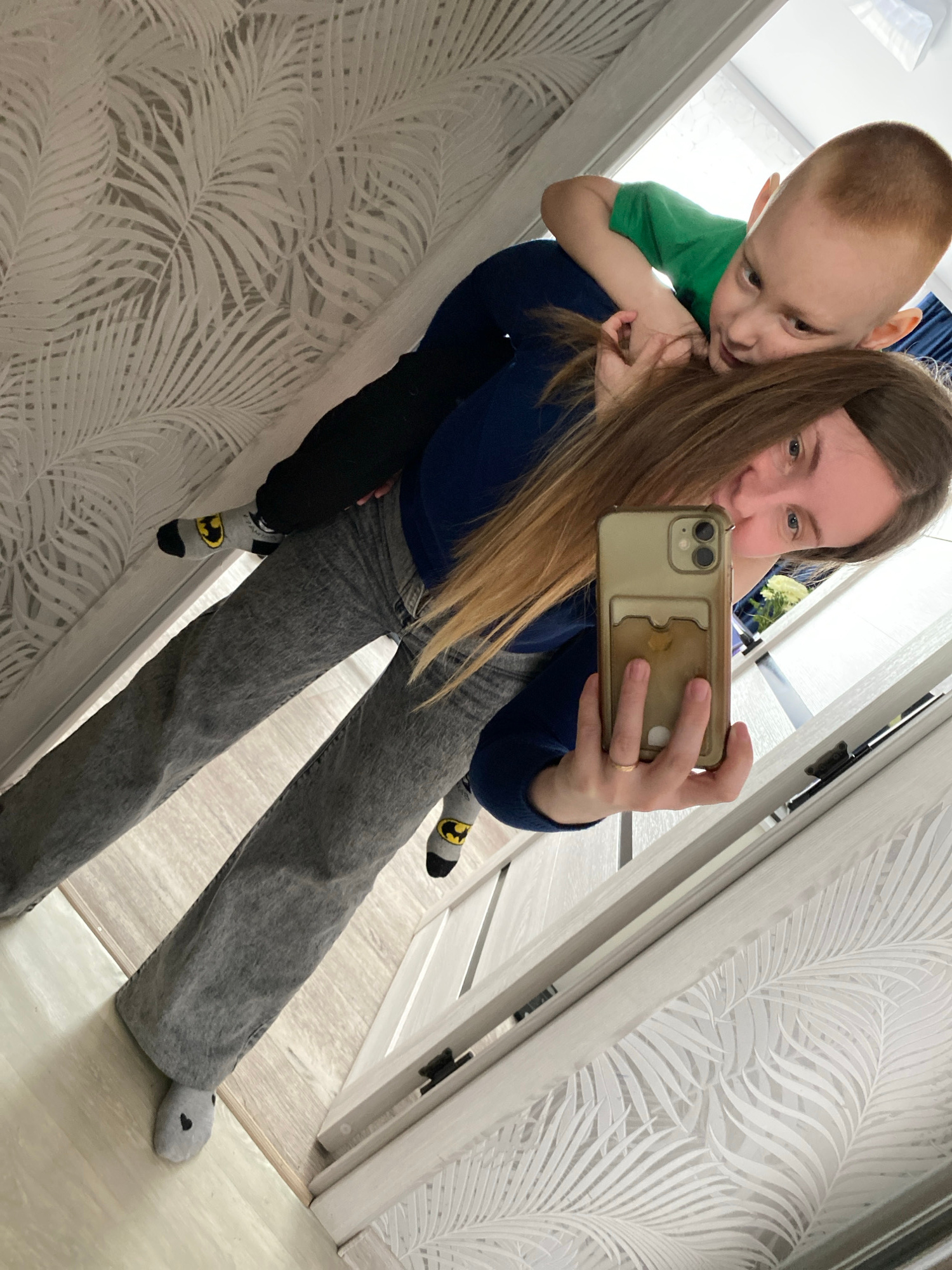A woman and child are taking a selfie in an interior location. The woman is holding a smartphone with a protective case, facing the camera, while giving a piggyback ride to a young boy wearing a green…read more