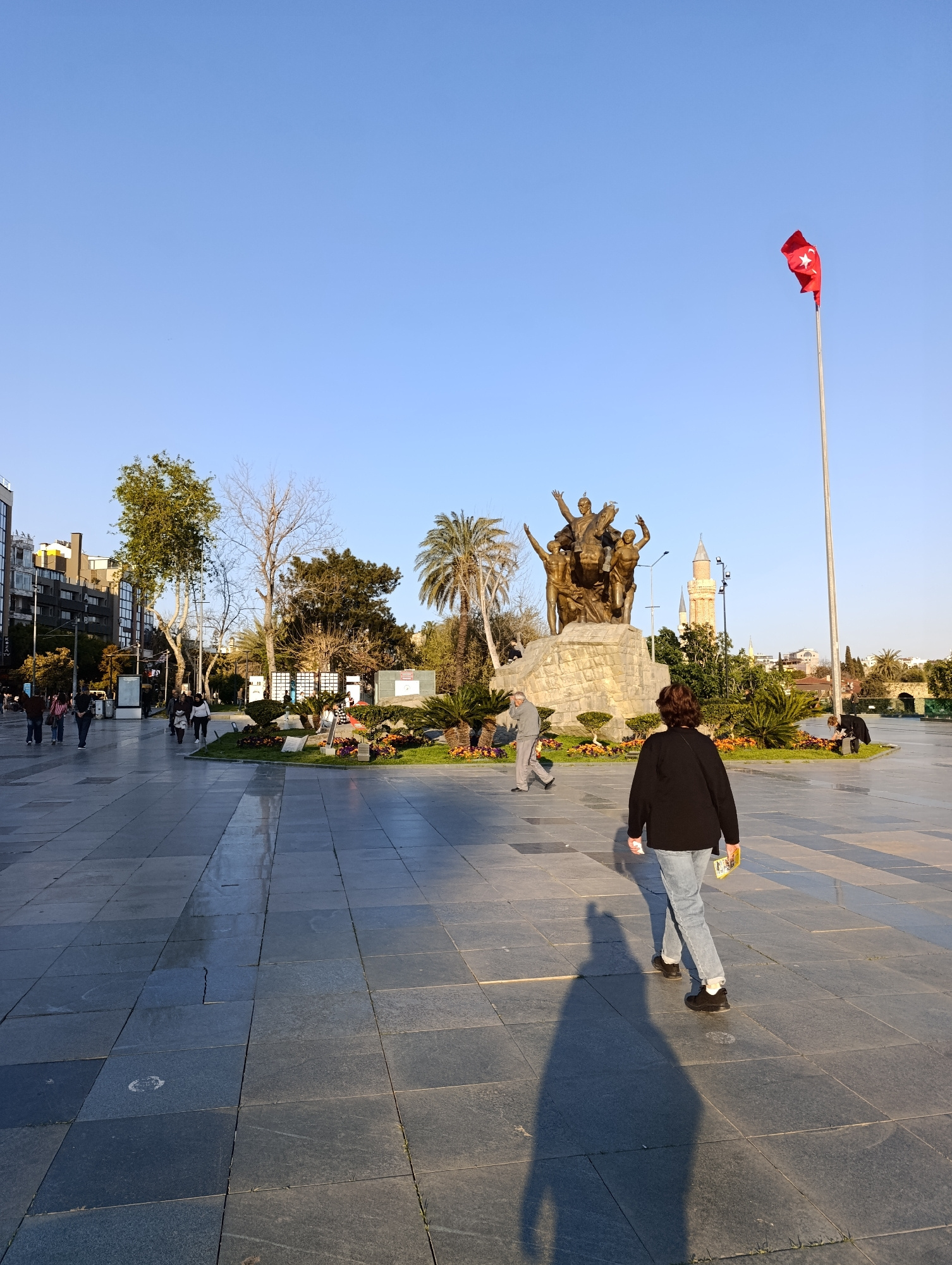 The image captures a sunny day in Antalya, Turkey, likely in a public square or park. A bronze statue depicting multiple figures stands prominently on a stone base, surrounded by trees, plants, and fl…read more