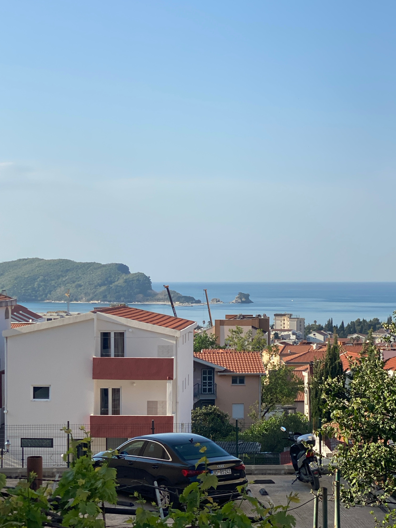 This image presents a panoramic, elevated view of a sunny coastal town, identified as Budva, Montenegro. The scene is captured on a clear day, indicated by the bright sunlight and a vast, light blue s…read more