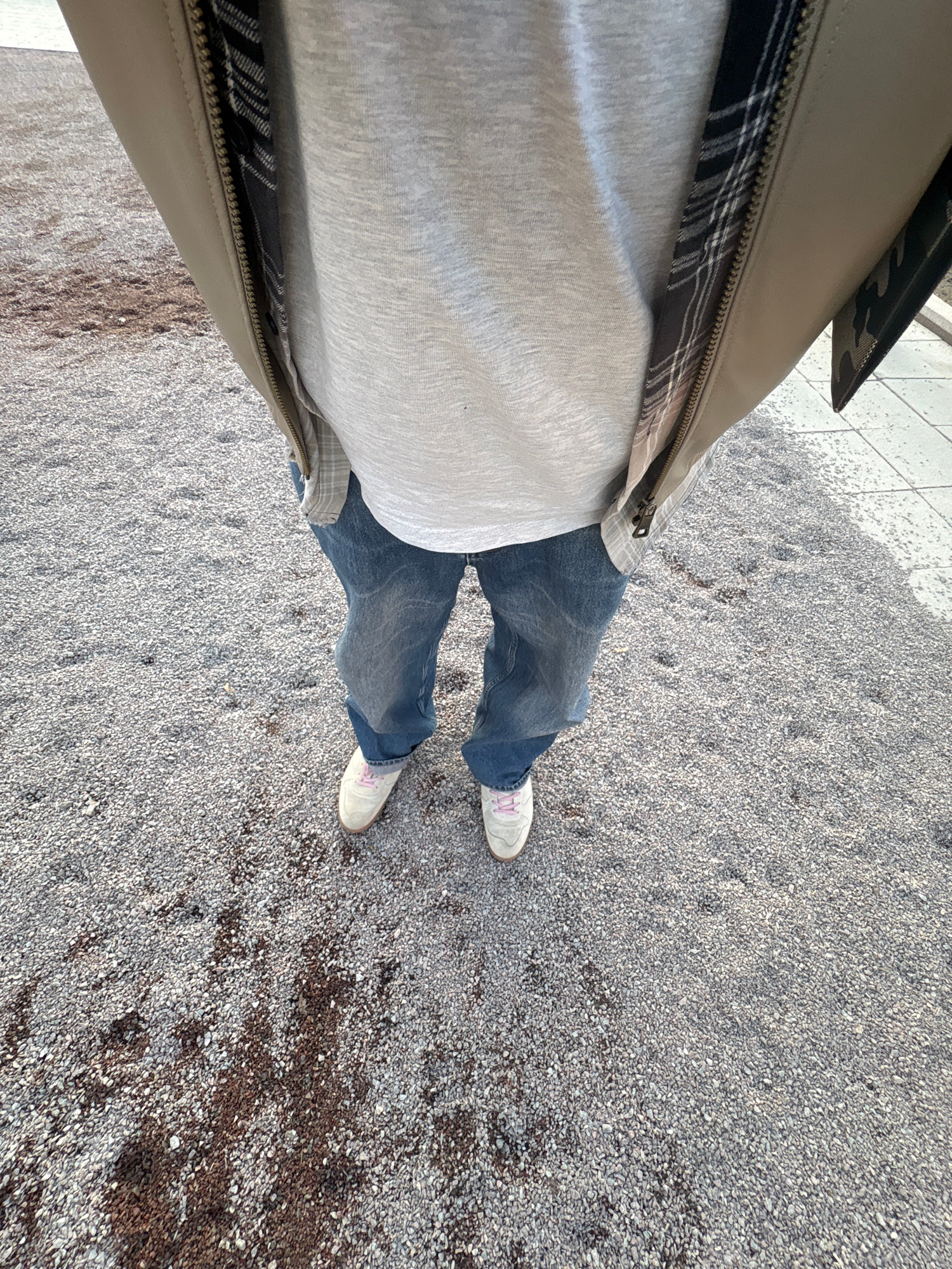 A medium-high angle shot depicts a person standing on a gravel surface, likely a sidewalk or path. The person is wearing blue jeans, off-white sneakers with pink laces, and a light grey long-sleeved s…read more