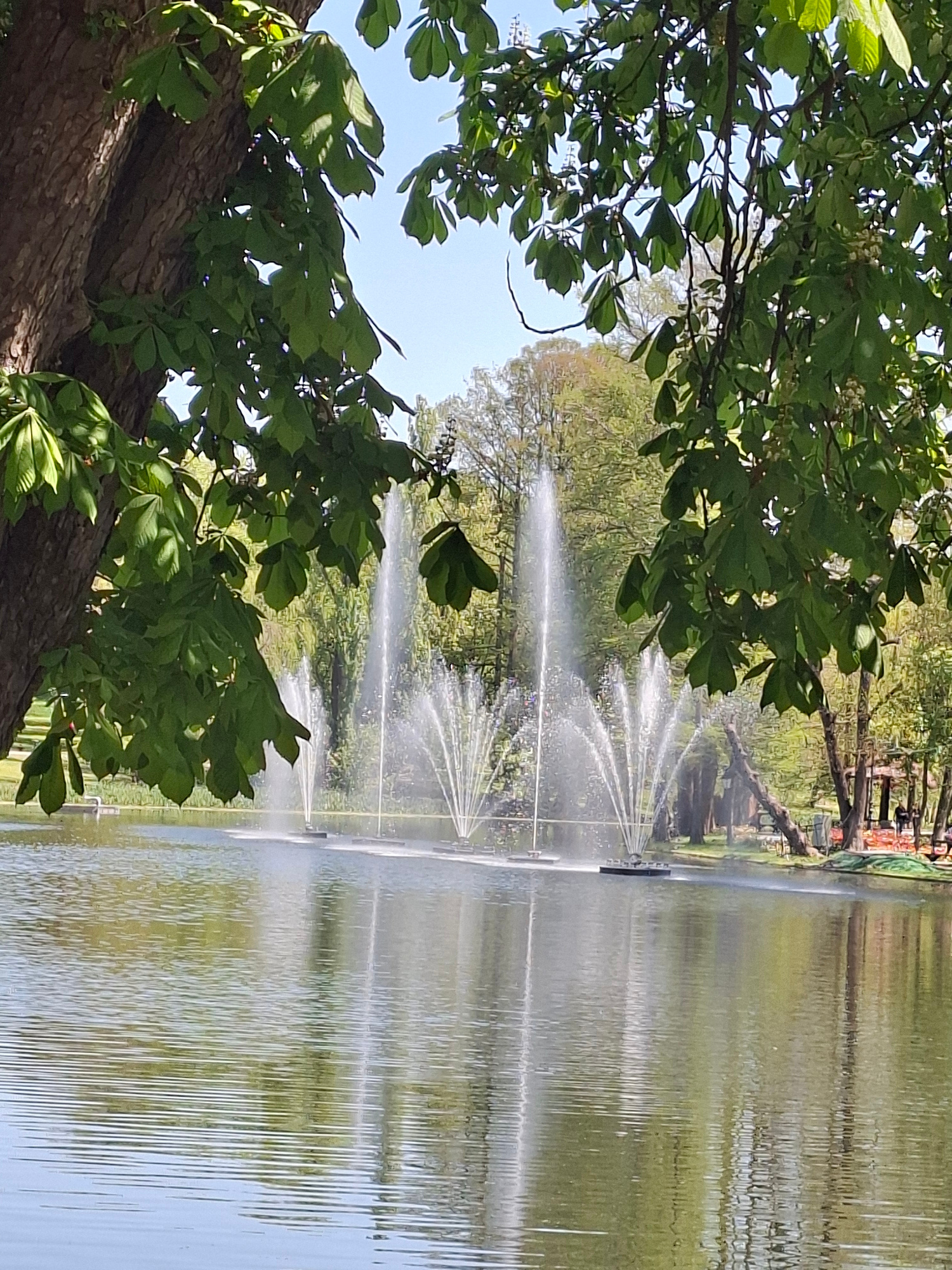 The image captures a scene from Nicolae Romanescu Park in Craiova, Romania, focusing on a body of water featuring three functioning fountains. The water's surface is rippled, reflecting the surroundin…read more