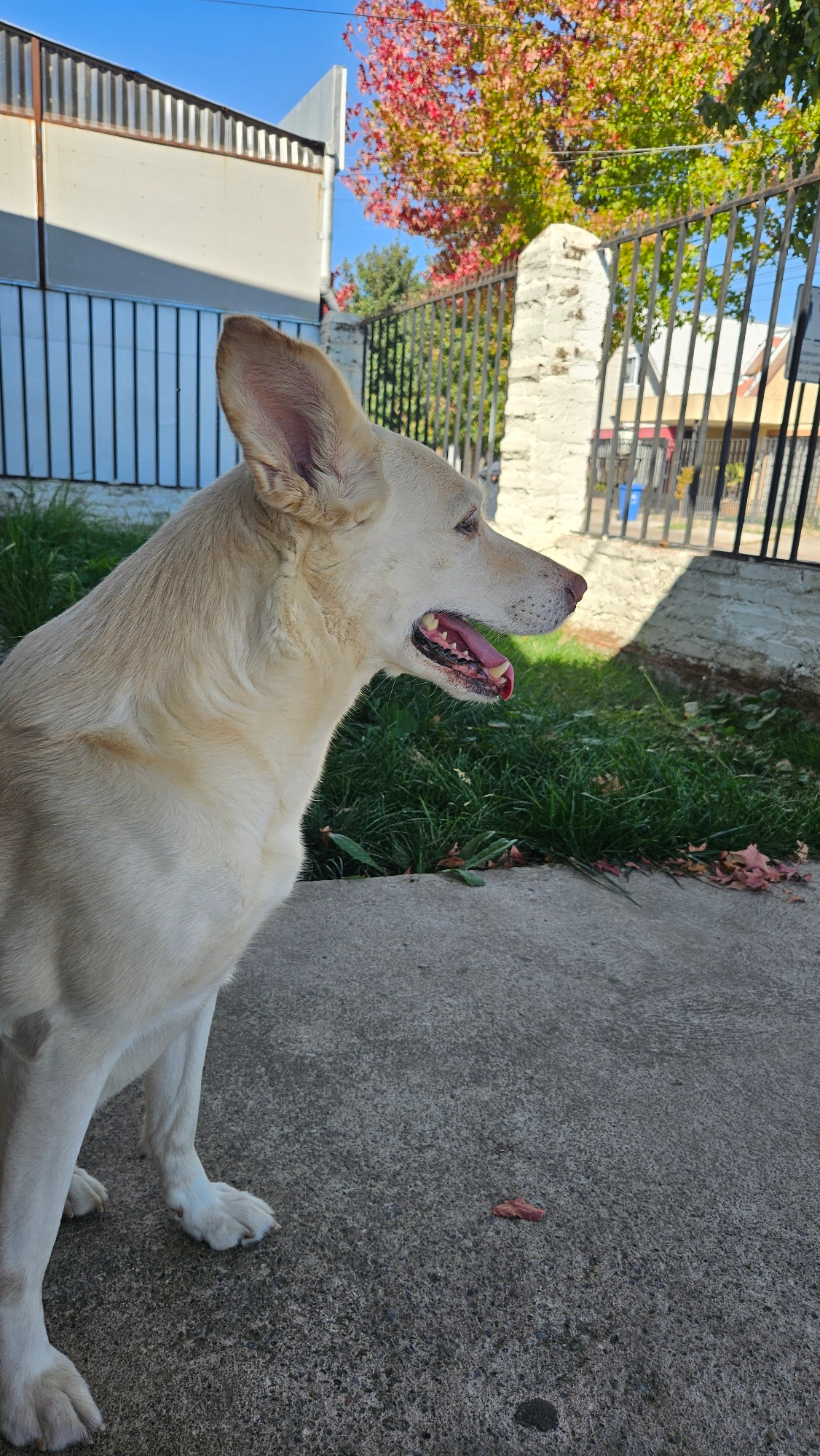 A golden Labrador dog is seen lying on a concrete surface, presumably a sidewalk or patio, outdoors. The dog's mouth is open, and its head is tilted upwards. The dog is resting near a patch of green g…read more