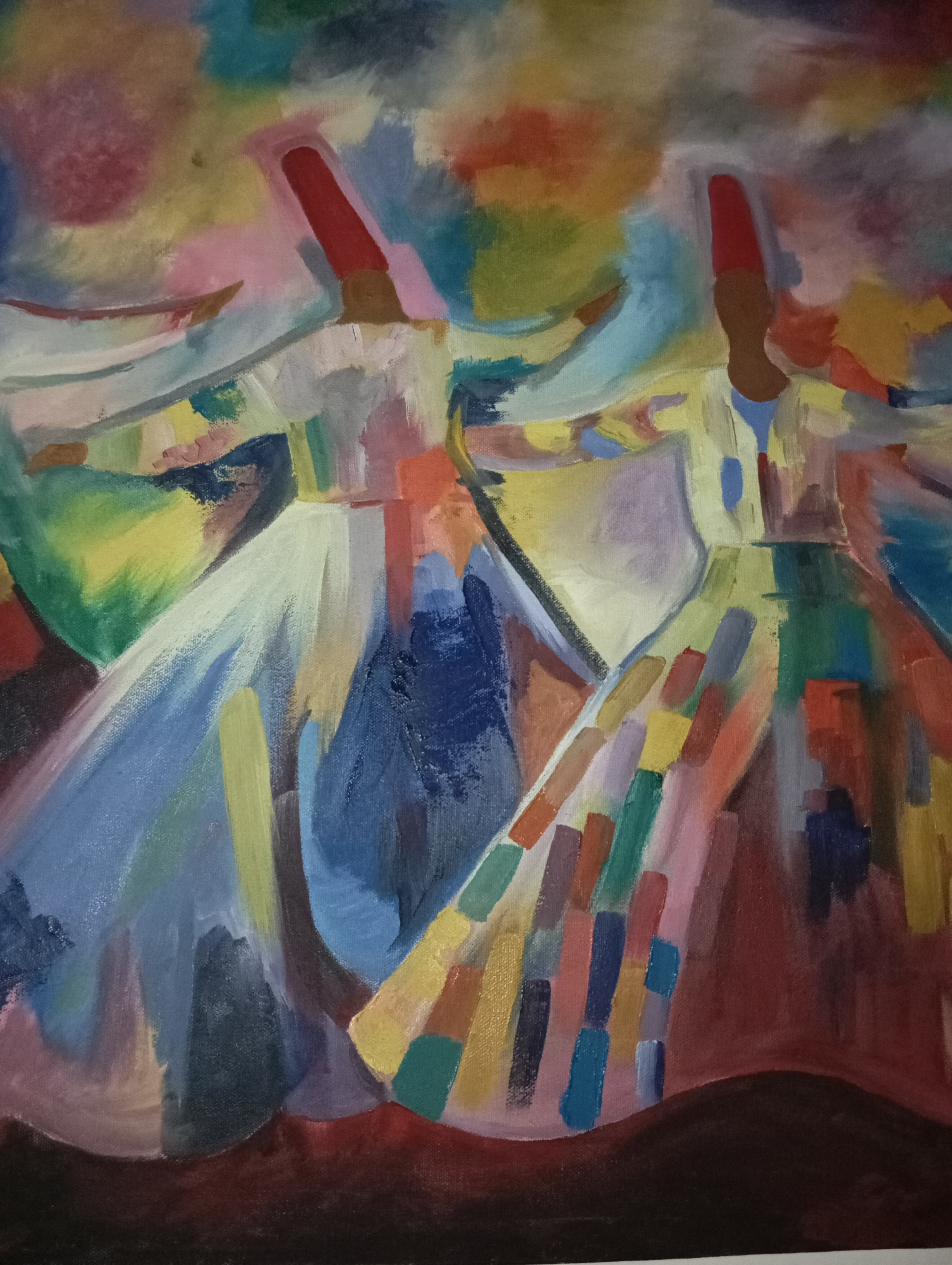 The image is an abstract oil painting depicting two whirling dervishes. They are wearing tall red conical hats, long white gowns, and open arms, in a posture typical of Sufi whirling. The gowns are pa…read more