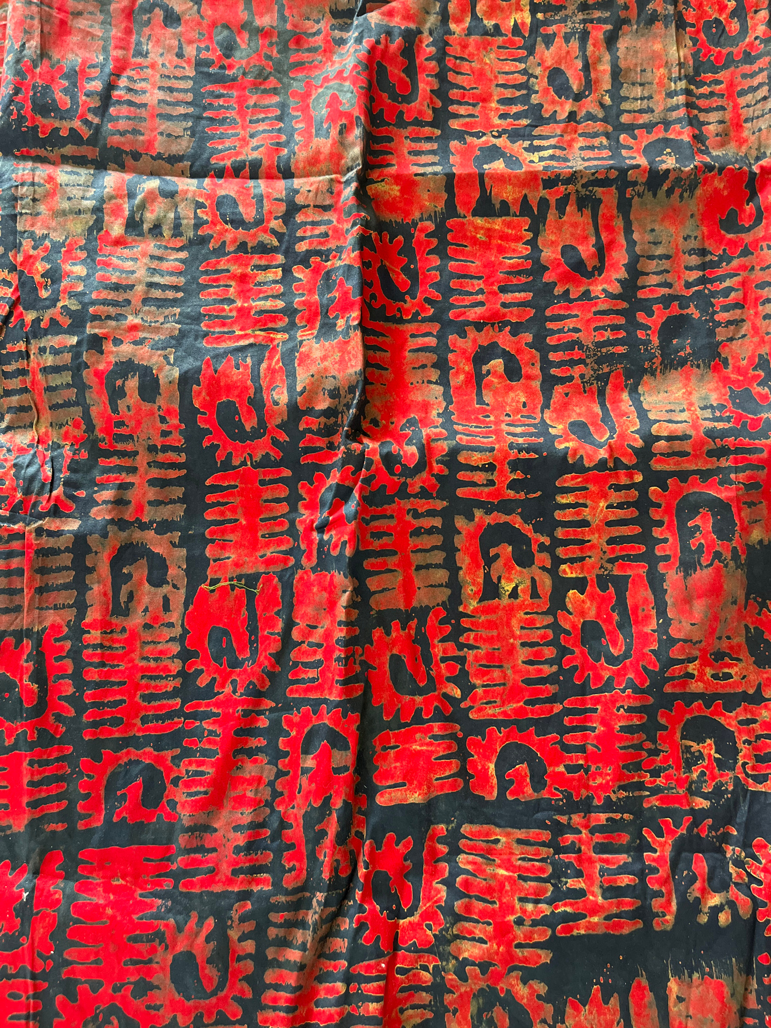 The image shows a piece of patterned textile, likely a fabric swatch. The primary colors are red and black, with some areas showing a bronze or brown undertone. The pattern appears to be a repeating m…read more