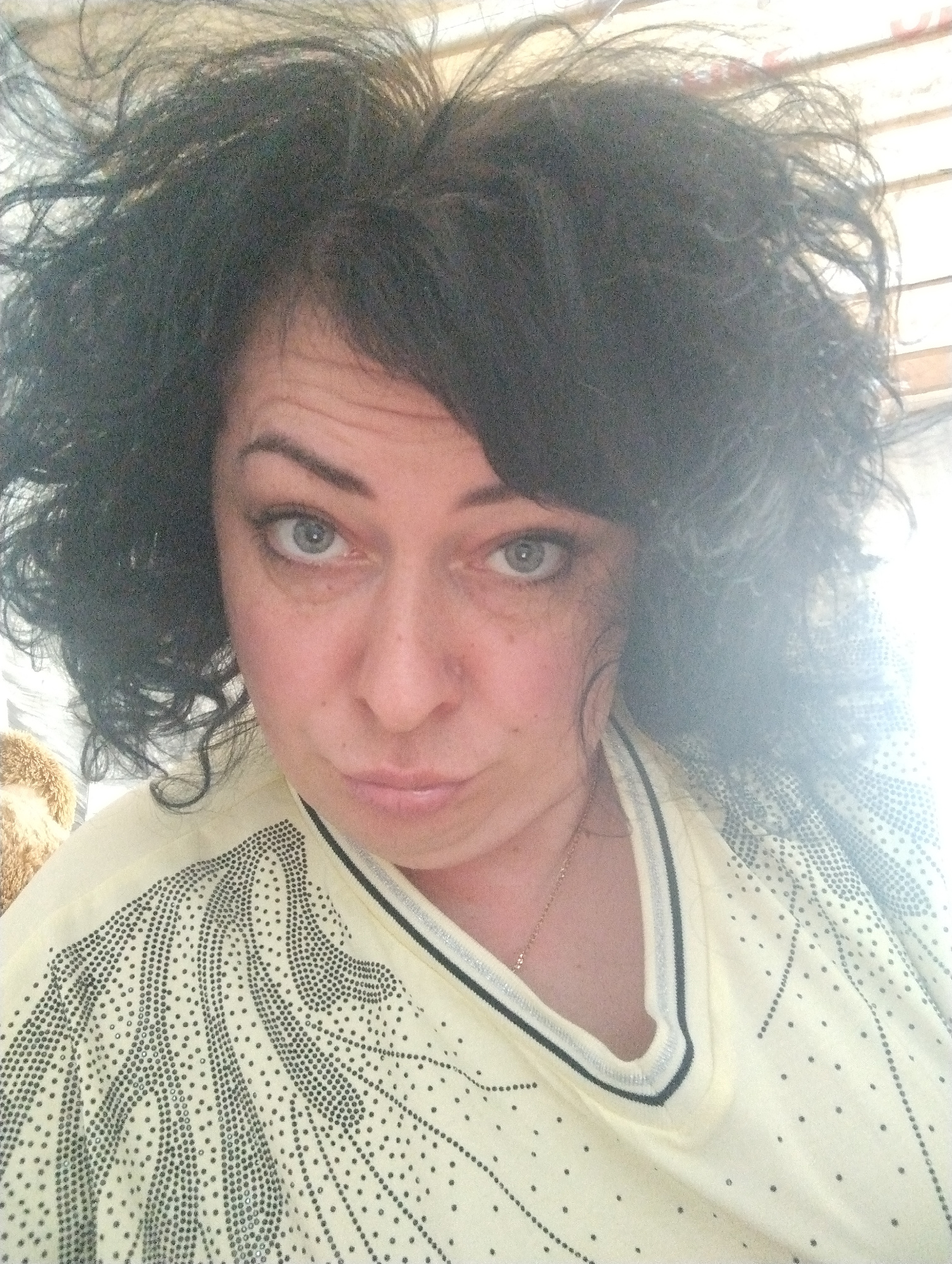 A close-up selfie of a middle-aged woman with dark, curly, somewhat disheveled hair. Her eyes are light blue, and she has a fair complexion with some visible skin imperfections. Her expression is a sl…read more