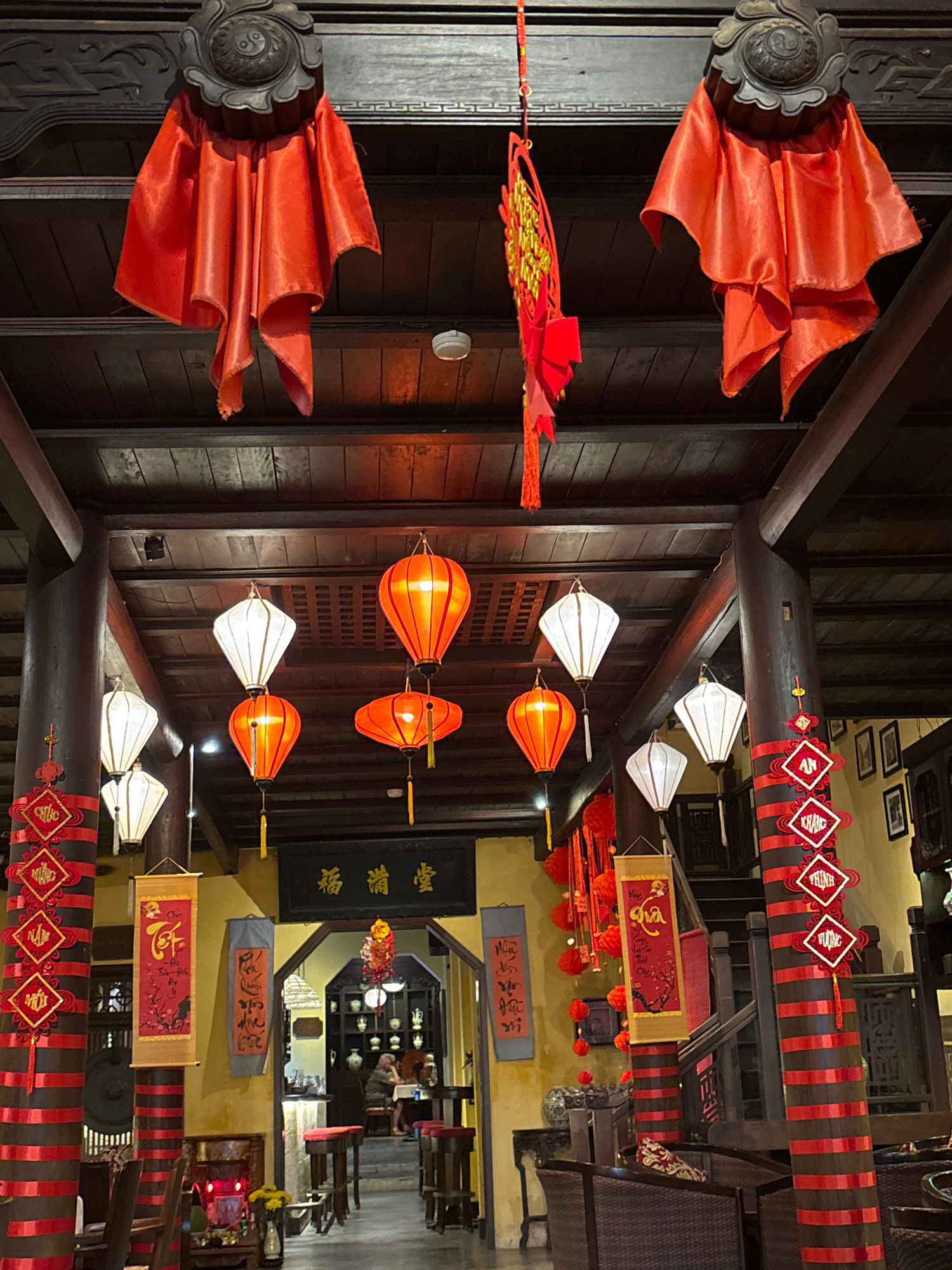 The image shows the interior of a building in Hội An Ward, Vietnam. The ceiling is adorned with dark wooden beams and numerous lanterns. There are three rows of lanterns: the top and bottom rows consi…read more