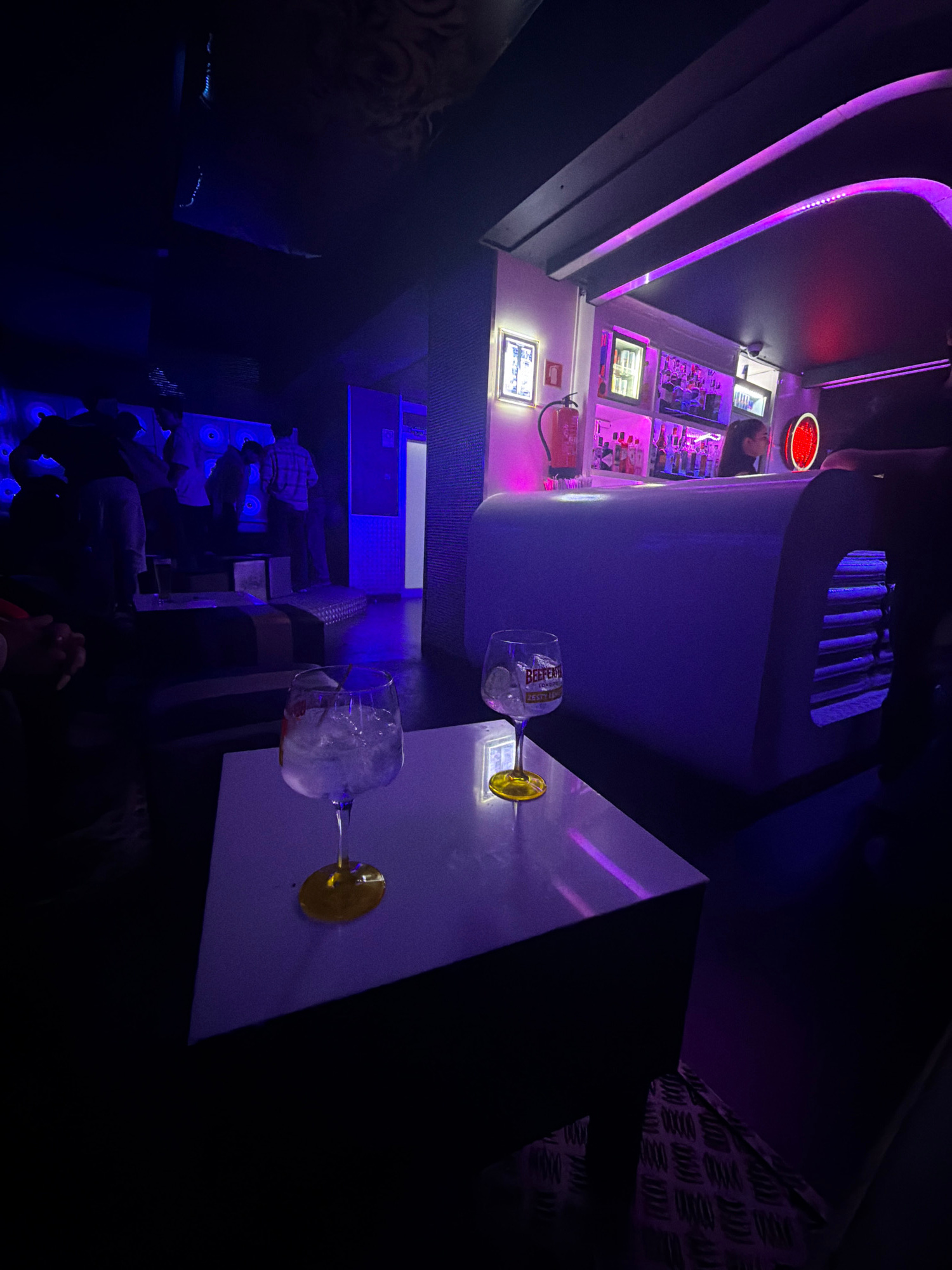 The image shows the interior of a bar, possibly in Vila Real, Portugal, given the context. The scene is dimly lit with blue and purple lighting. Two cocktail glasses, one with a "Beefeater" label, are…read more