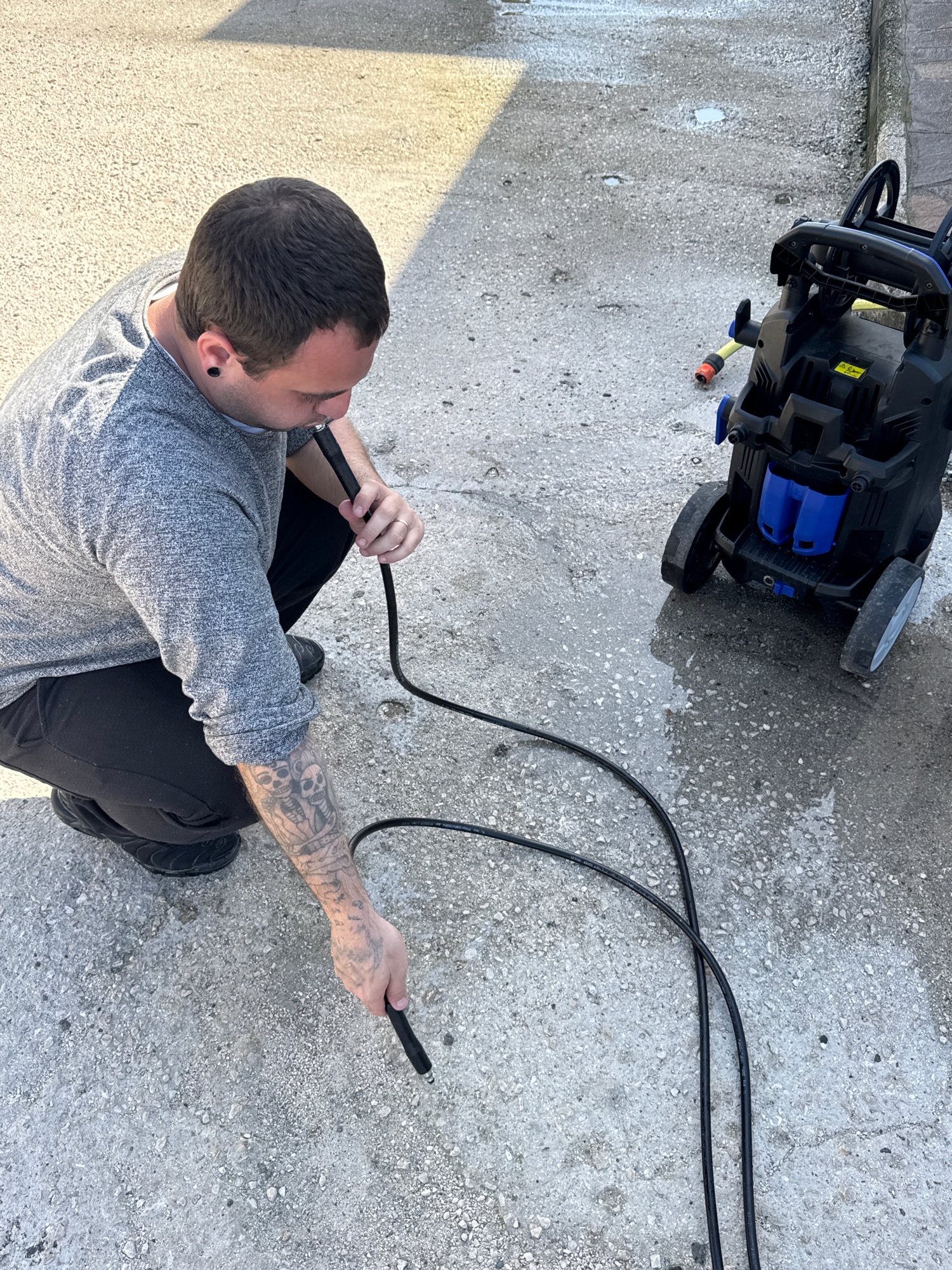 The image, taken in Aprilia, Italy, presents an overhead view of a man outdoors, engaged with pressure washing equipment. The man, positioned in the lower-left portion of the frame, has short dark hai…read more