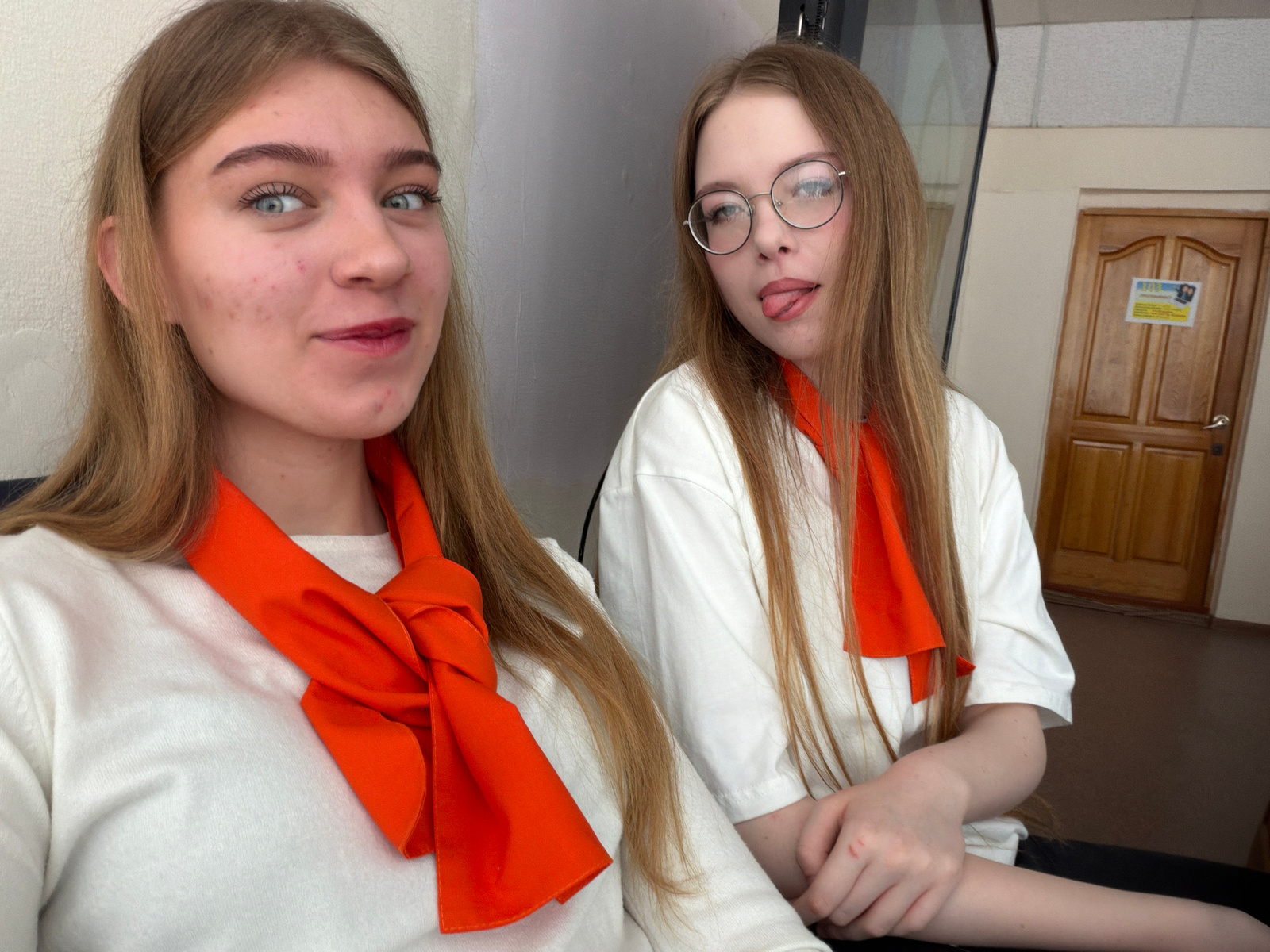 Two young women wearing white shirts and orange neckerchiefs are posing for a photo. One is wearing round glasses and sticking her tongue out, while the other is looking directly at the camera. The lo…read more