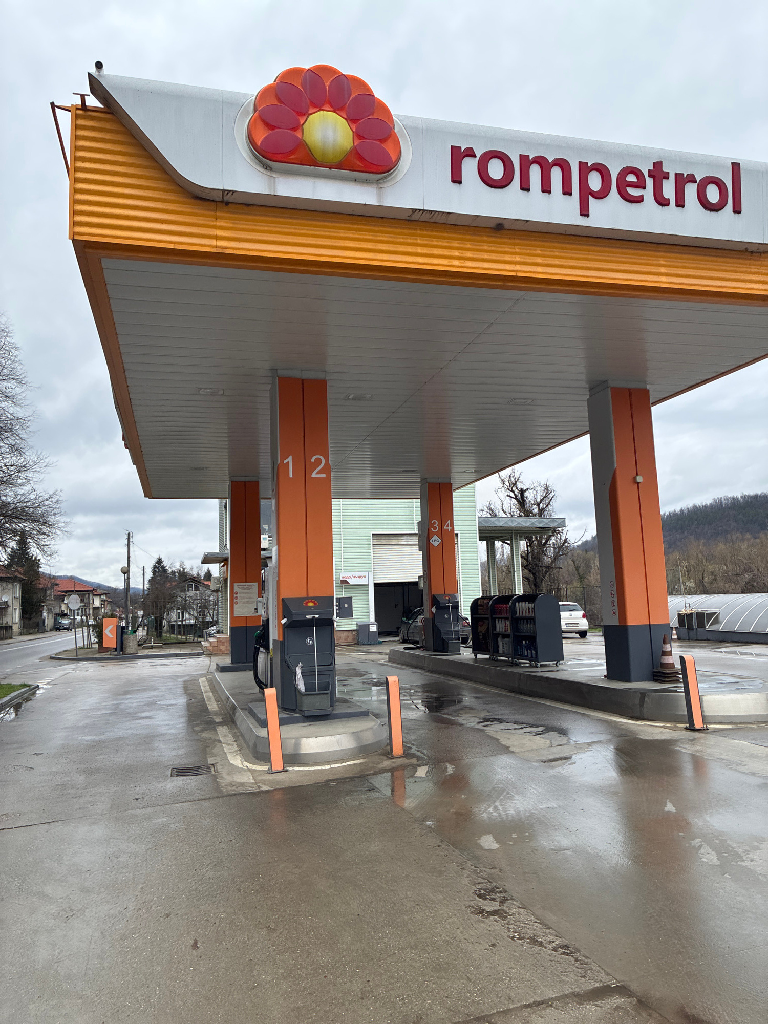 The image depicts a Rompetrol gas station. The ground appears wet, suggesting recent rain. The station's canopy extends over several gas pumps. The signage is prominent, featuring the Rompetrol logo.…read more