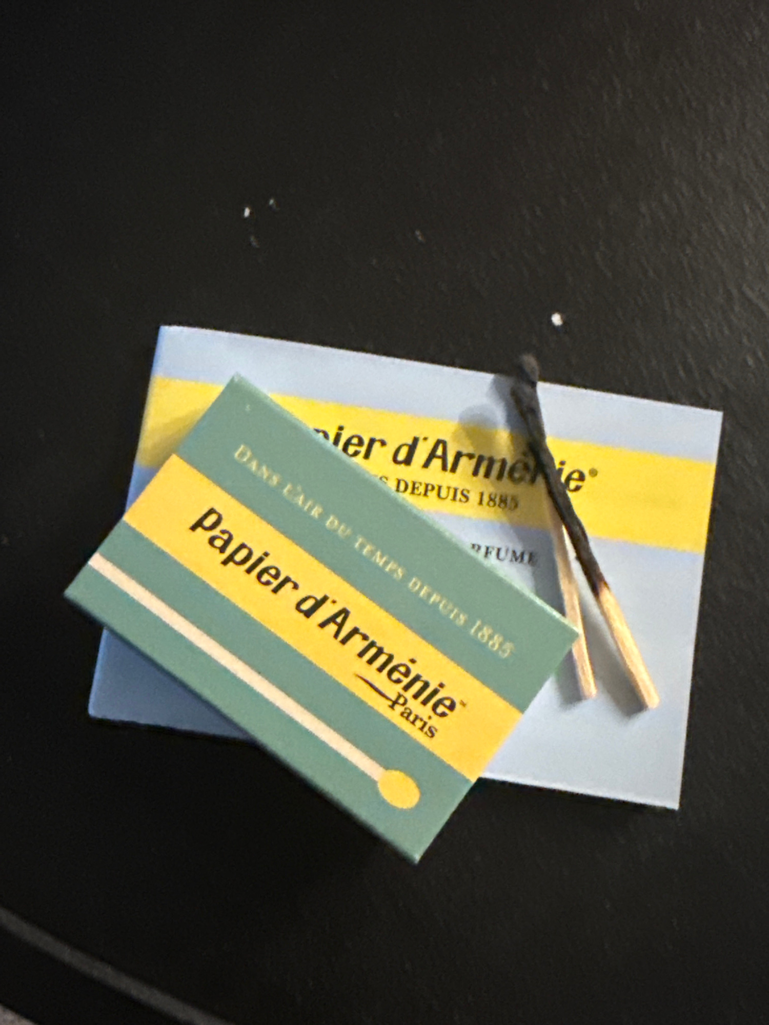 The image shows two booklets of Papier d'Arménie, a type of incense paper, with two matchsticks lying on top. One match is unused, while the other is burned. The booklets are light blue and teal with…read more