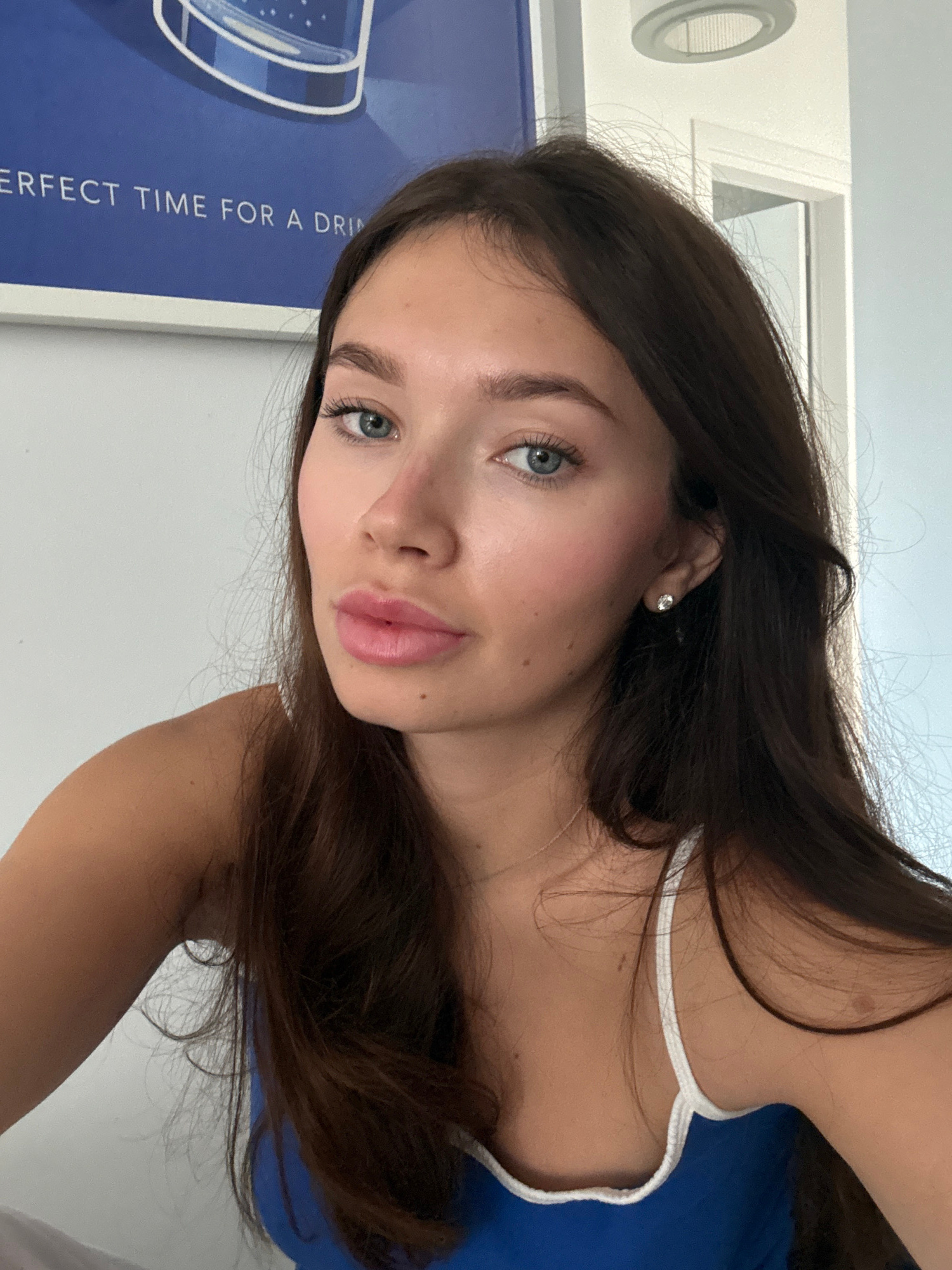 A selfie of a young woman with long brown hair, fair skin, and blue eyes. She is wearing a blue top with white straps. An earring is visible in her left ear. Behind her is a white wall with a poster t…read more