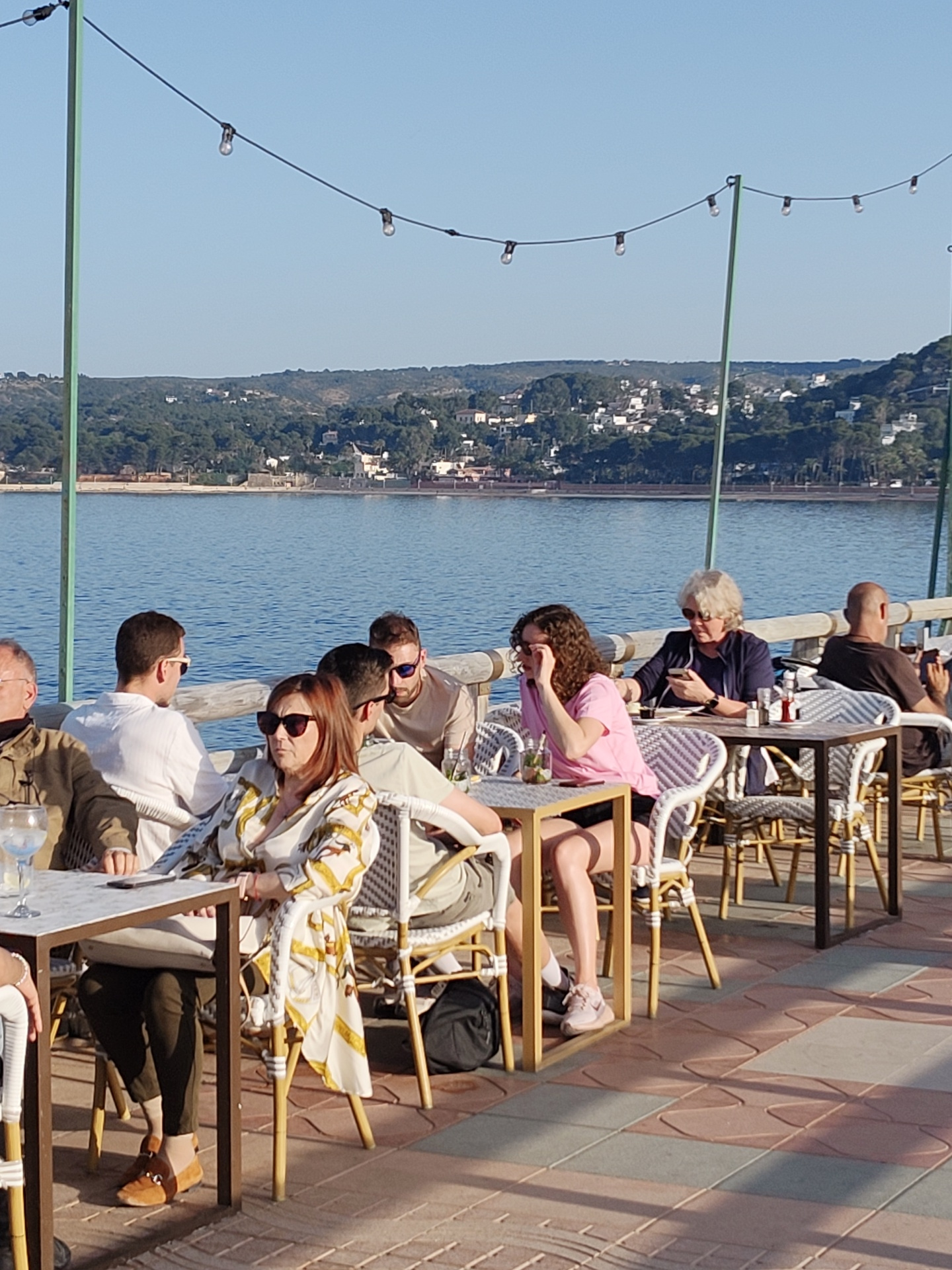 The image shows a group of people dining at an outdoor restaurant in Dénia, Spain, evidenced by the waterfront view. Eight individuals are seated at three tables. The table closest to the camera is oc…read more