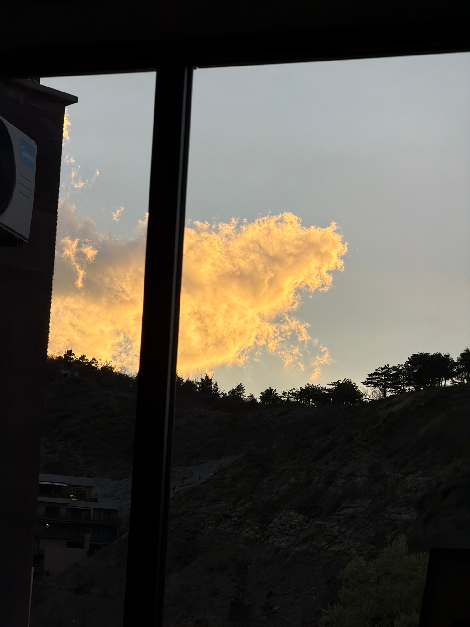 The image shows a view from inside a building in Tbilisi, Georgia, looking out a window at a bright cloud lit by golden light against a pale sky. A steep, dark rock face covered with trees is visibleβ¦read more