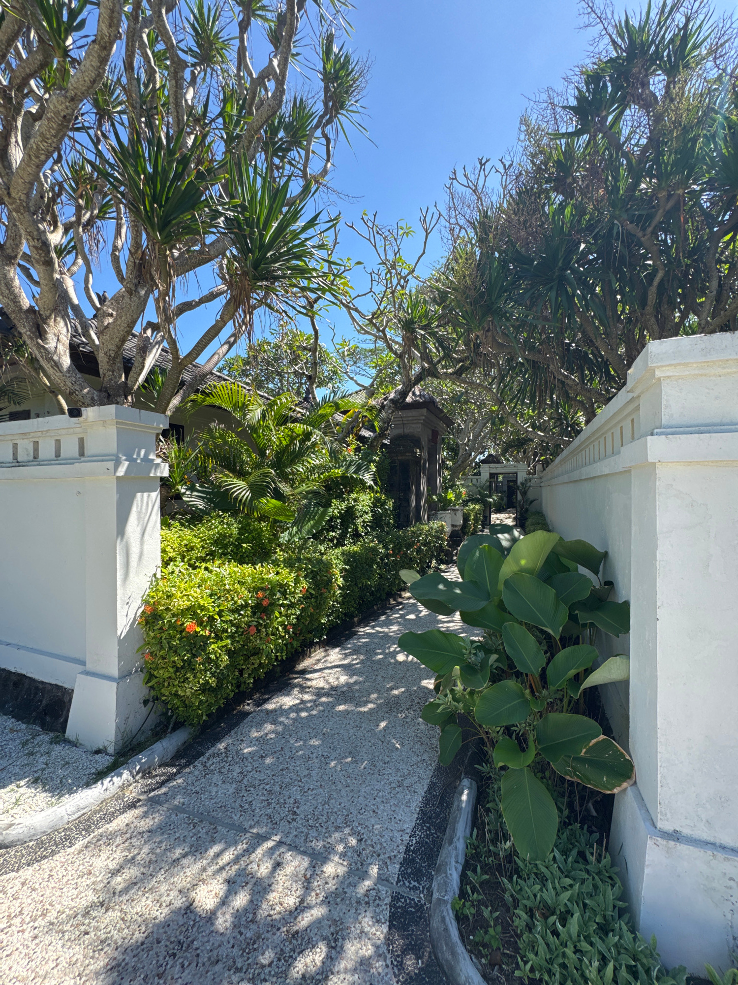 The image depicts a stone pathway lined with tropical vegetation and bounded by white walls. The scene is bathed in sunlight, casting shadows on the pathway. The vegetation consists of various plants,…read more