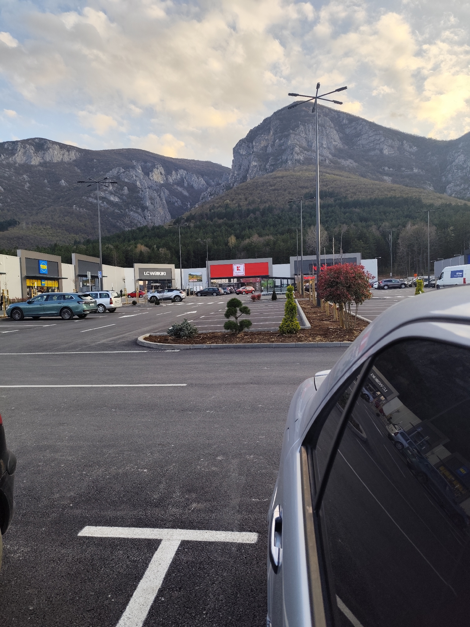 The image shows an outdoor scene in a shopping center parking lot with mountains in the background. The shopping center features stores like Lidl, LC Waikiki, and Kaufland. There are several parked ca…read more