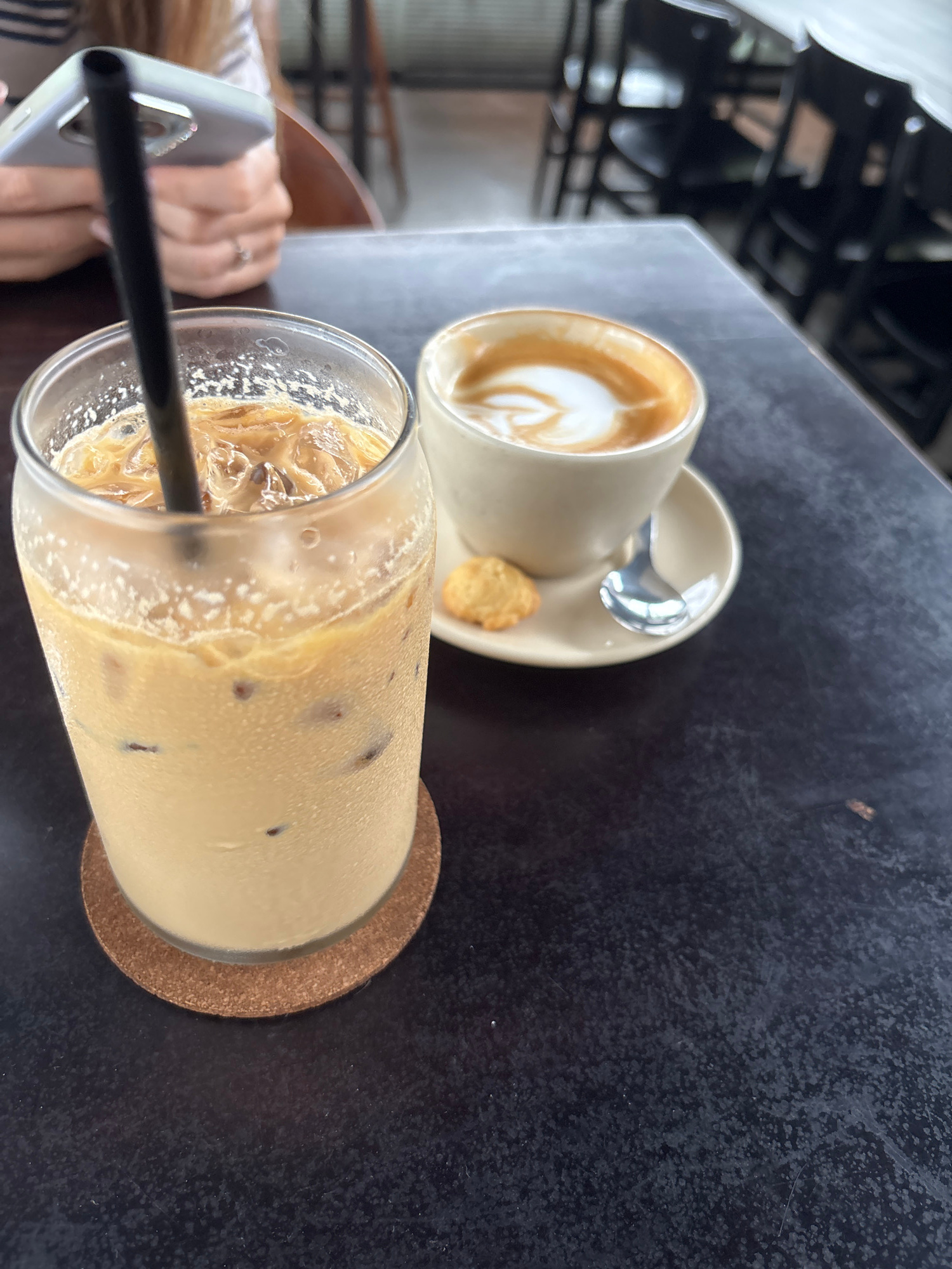 The photograph presents a top-down view of a table setting with two beverages, likely taken in Kuta Selatan, Indonesia. On the left is a small ceramic cup of latte with visible latte art, resting on a…read more