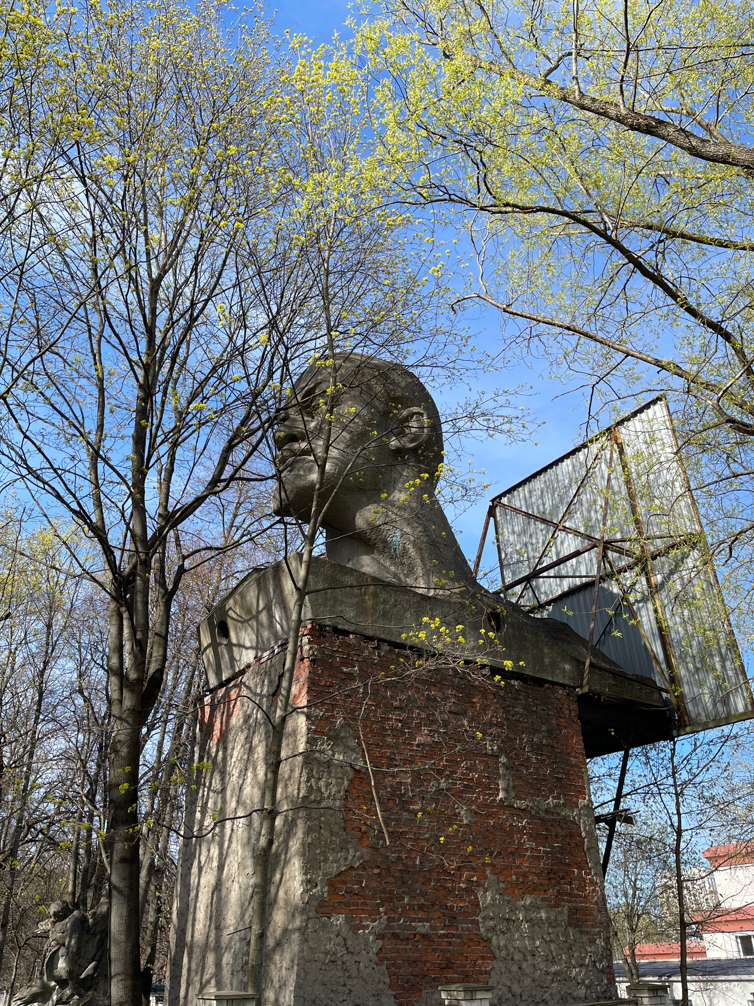 The image displays an outdoor scene in Khimki, Russia, dominated by a large, weathered bust of a male figure, likely a monument or statue. The bust, appearing to be made of concrete or stone, shows si…read more