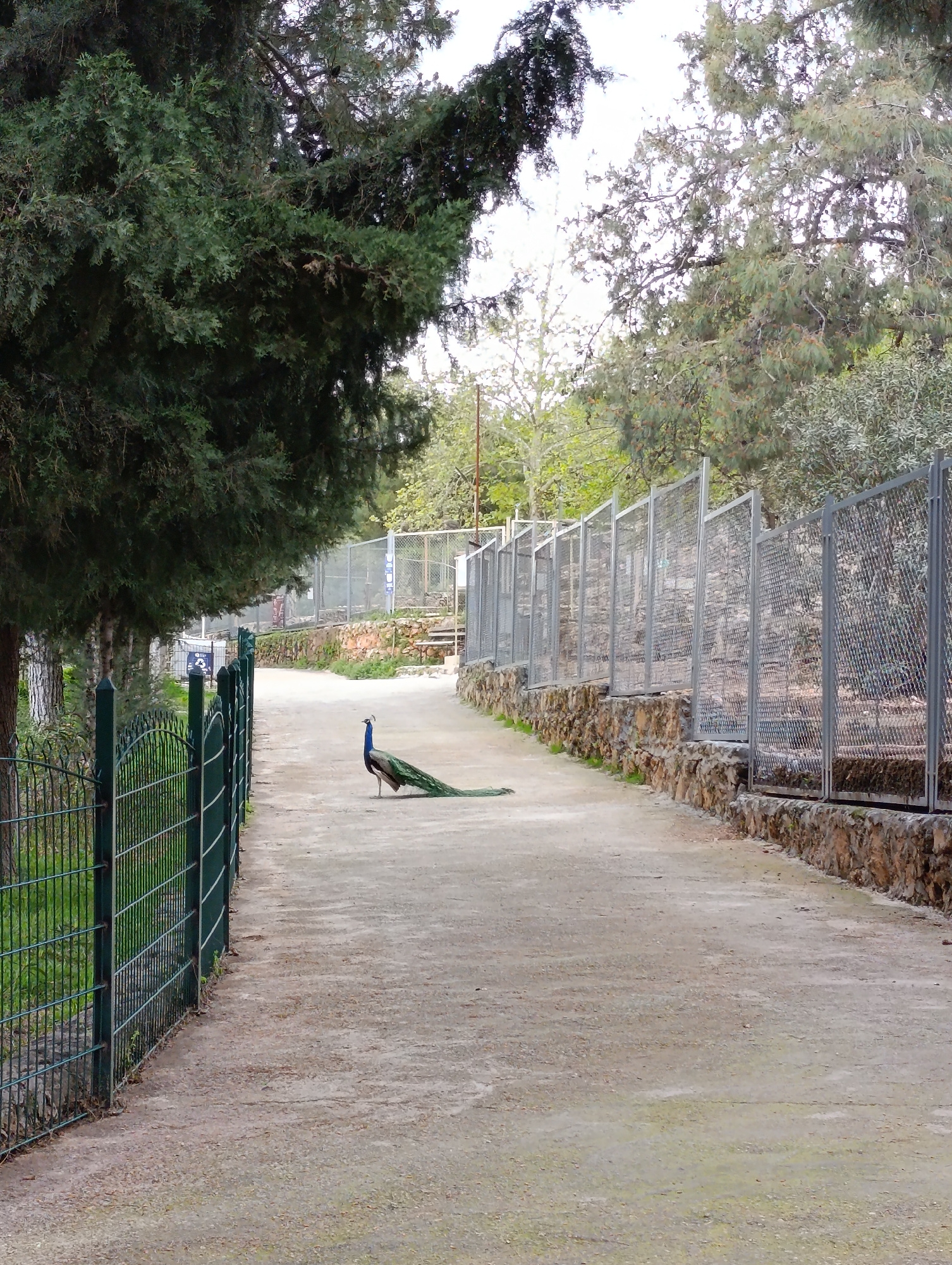 A photograph depicts a pathway in Kepez, Turkey, distinguished by a peacock standing prominently in the center of the path. The pathway is bordered on either side by fences; a green, wrought iron fenc…read more