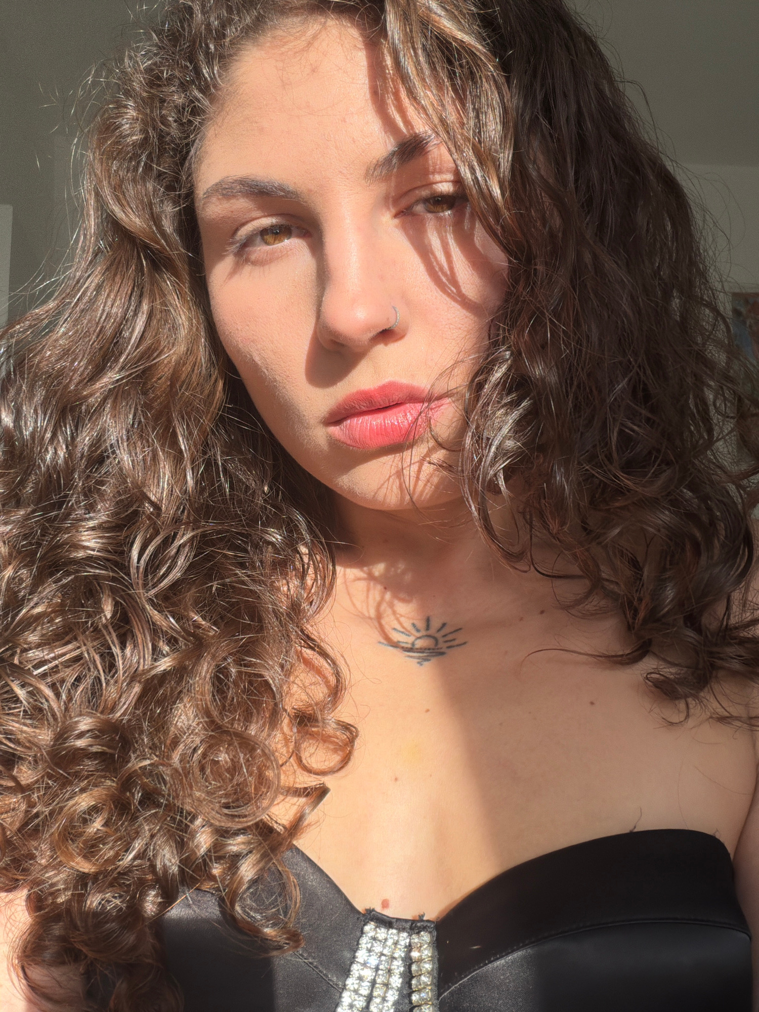 A woman with brown curly hair, light skin, and a tattoo of a sun on her collarbone is positioned in a close-up shot. She is wearing a black top with a jeweled strap. The scene is illuminated by sunlig…read more