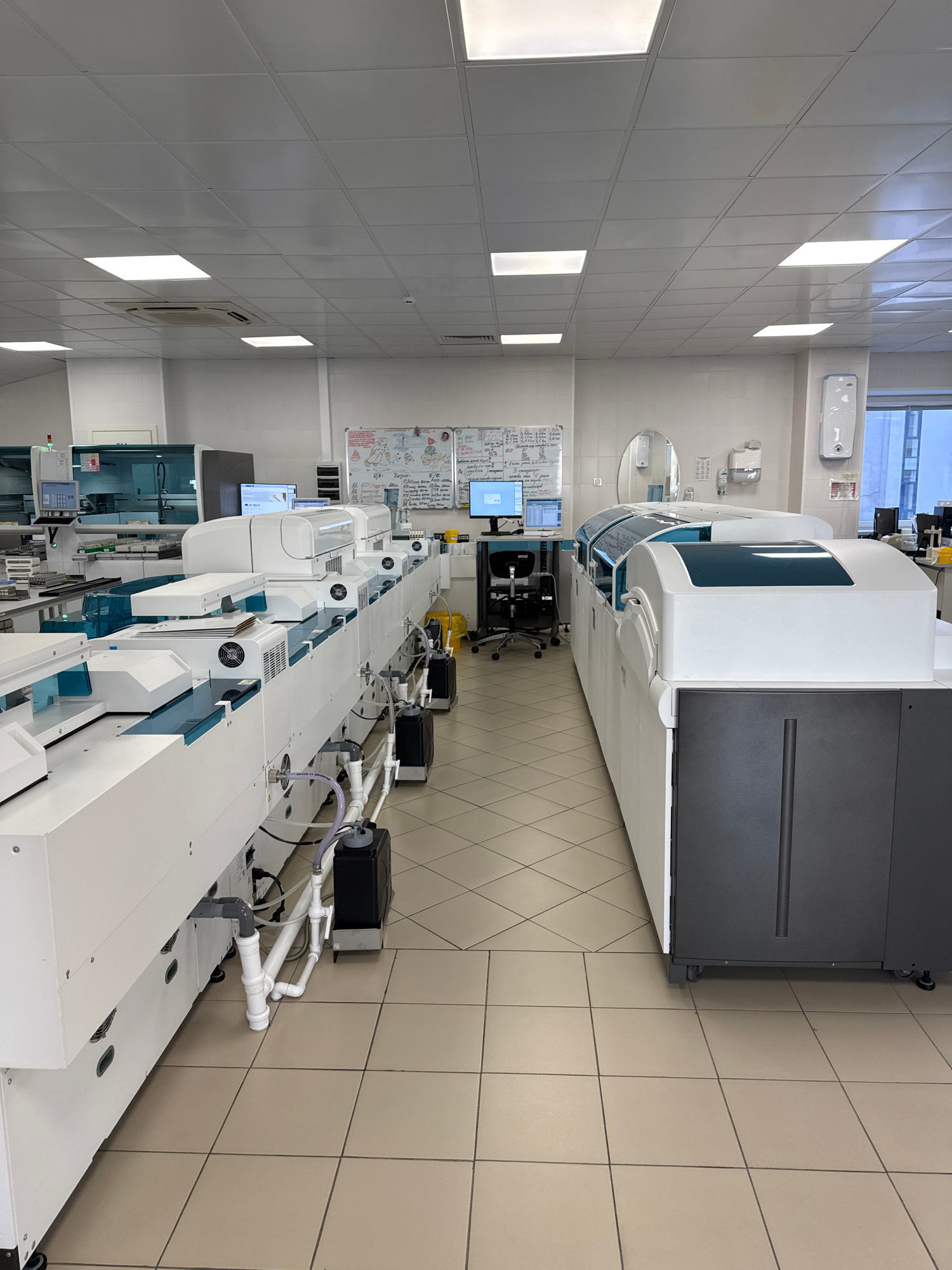 The image displays a clean, well-lit laboratory environment in Moscow, Russia, equipped with an extensive array of automated diagnostic machinery. No individuals are present in the scene. The primary…read more