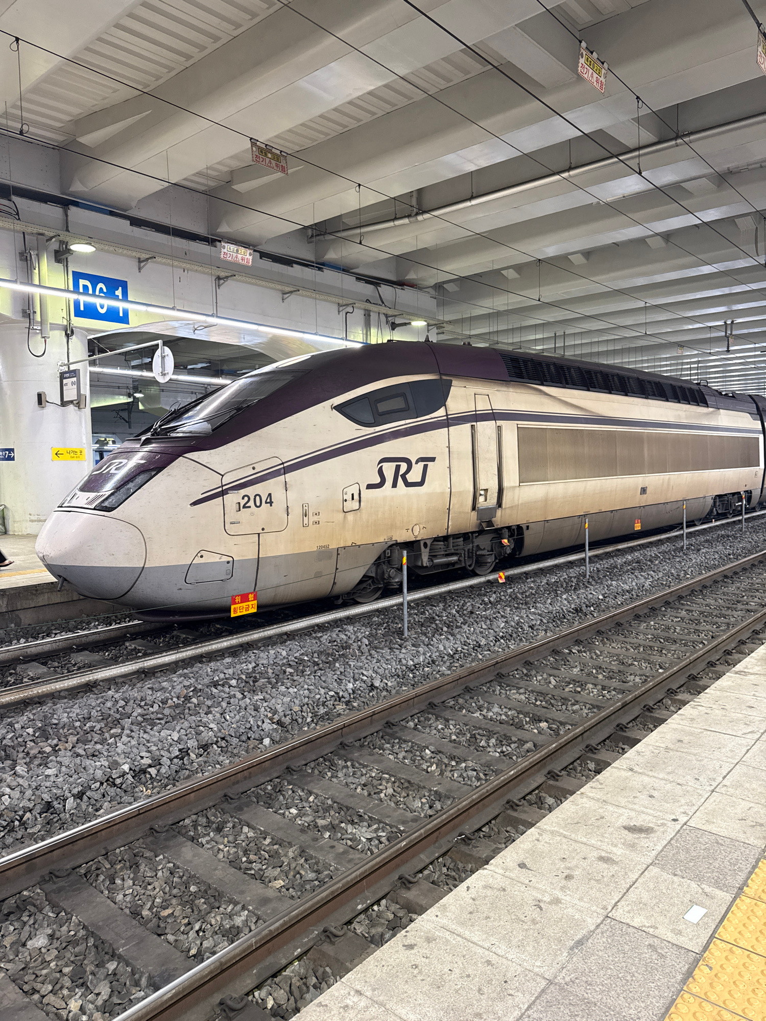 The image captures a high-speed train, identified as an SRT (Super Rapid Train), stationed at a platform in Daegu, South Korea. The train is predominantly white with purple accents, and the number "12…read more