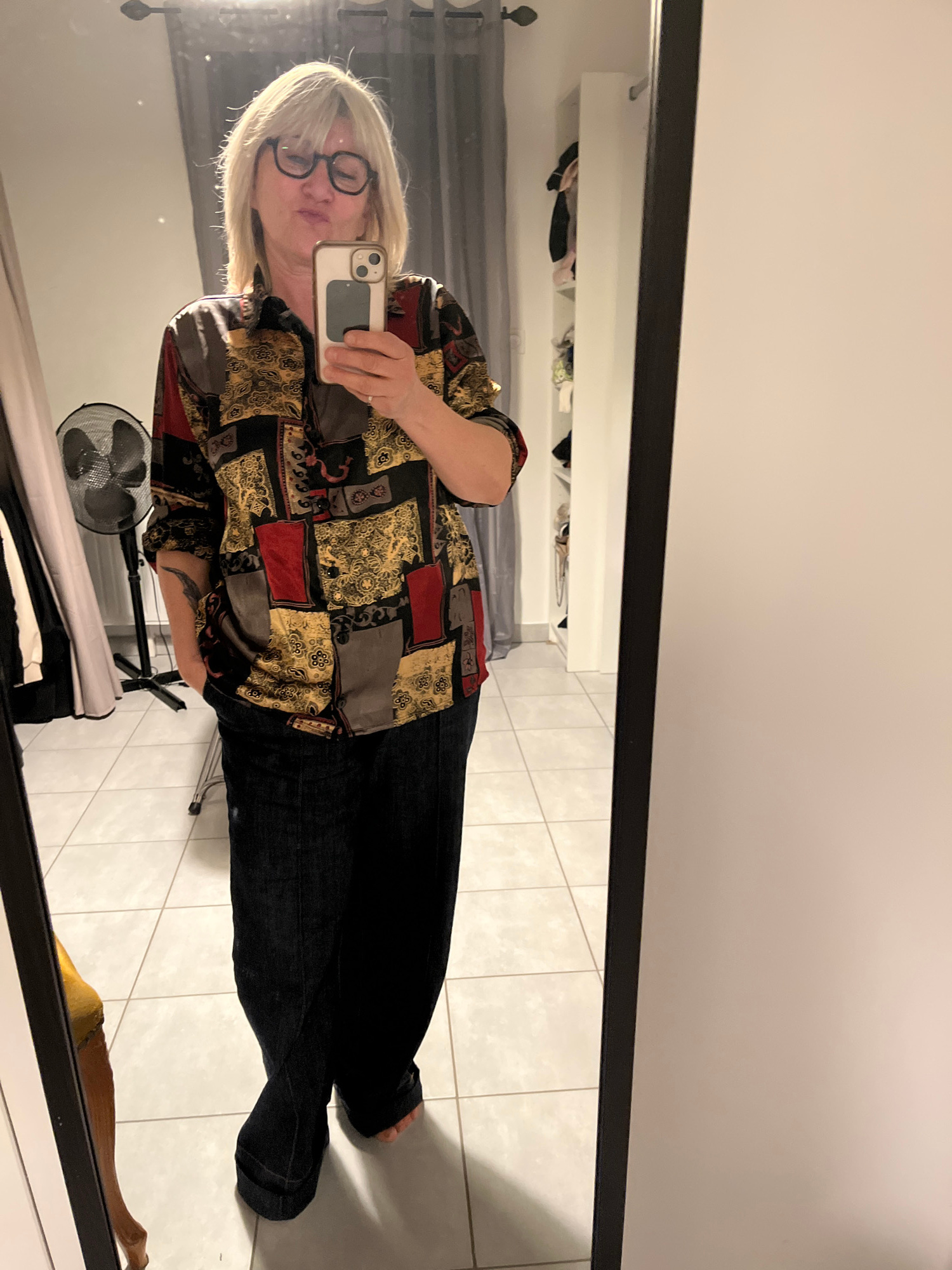 A mirror selfie captures an individual indoors in Chambœuf, France. The subject, a blonde-haired person wearing dark-rimmed eyeglasses, stands facing the mirror with puckered lips. They are dressed in…read more