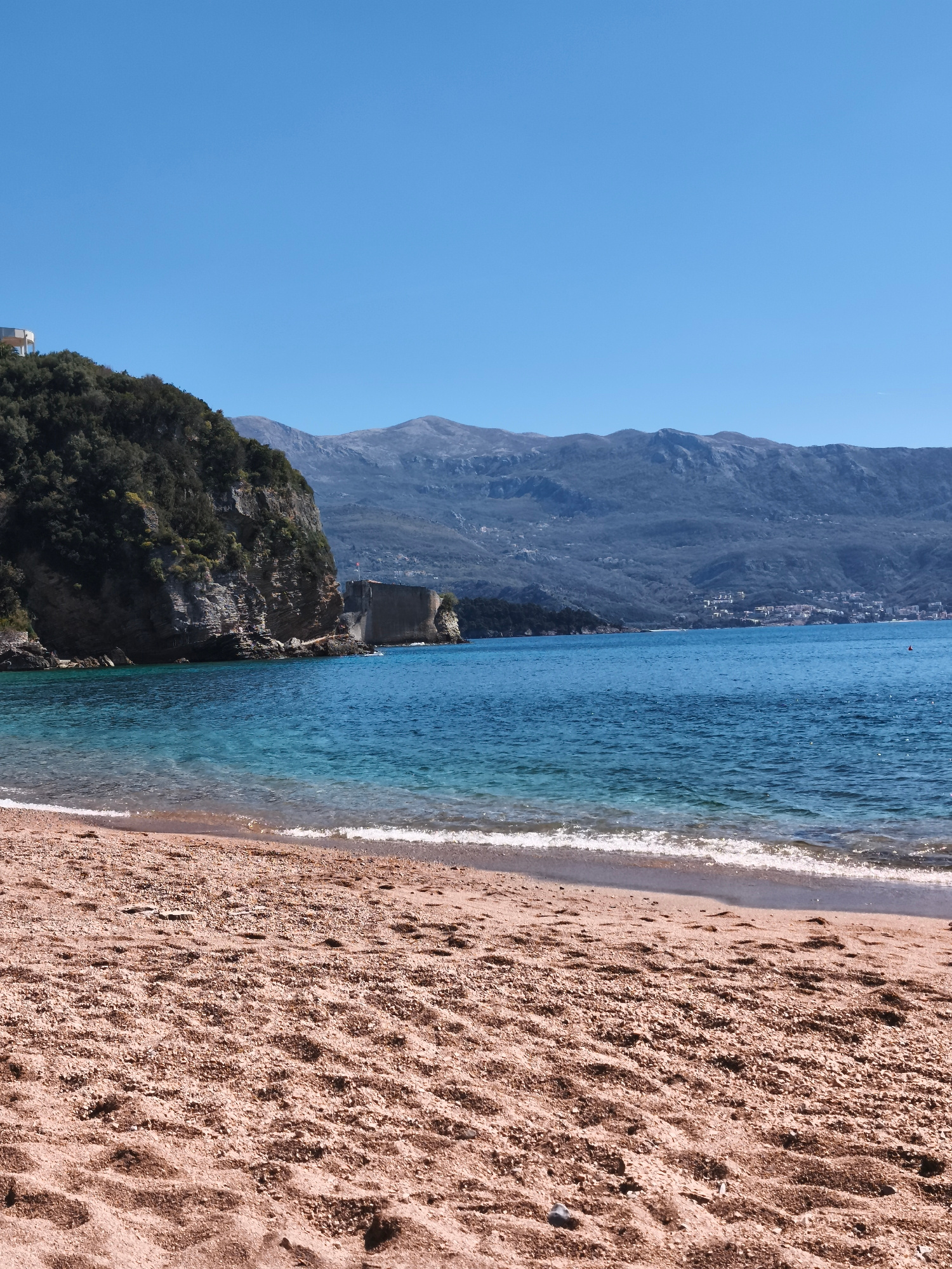 A coastal scene in Budva, Montenegro, features a sandy beach in the foreground. The blue Adriatic Sea meets the shore with small waves. To the left, a rocky cliff covered with trees extends into the s…read more