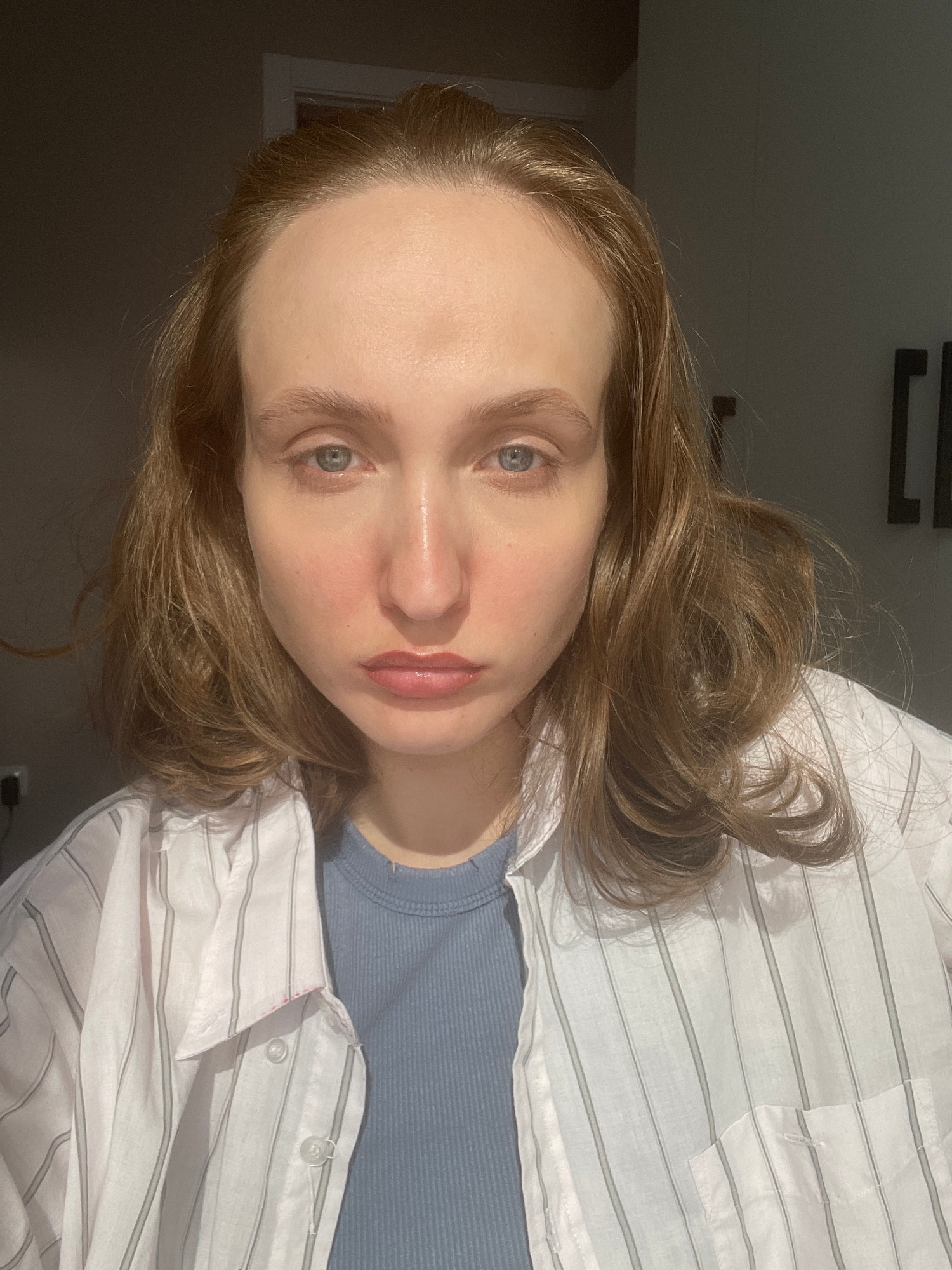 A woman with fair skin and light brown hair is shown in a close-up, slightly tilted view. She has light blue eyes and pink lips. She is wearing a blue ribbed t-shirt and a white button-down shirt with…read more