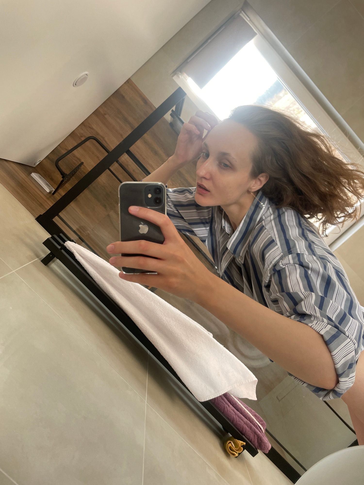 A young woman with long brown hair, wearing a blue and white striped button-down shirt, is captured in a mirror selfie. She is holding a dark-colored iPhone, which has a clear case and visible Apple l…read more