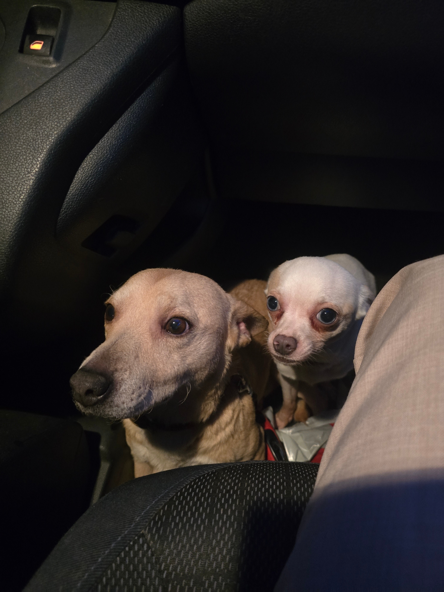 Two small dogs are visible in the passenger seat of a vehicle. One dog is light brown, and the other is primarily white with a pinkish tint around its face. The background shows parts of the car inter…read more