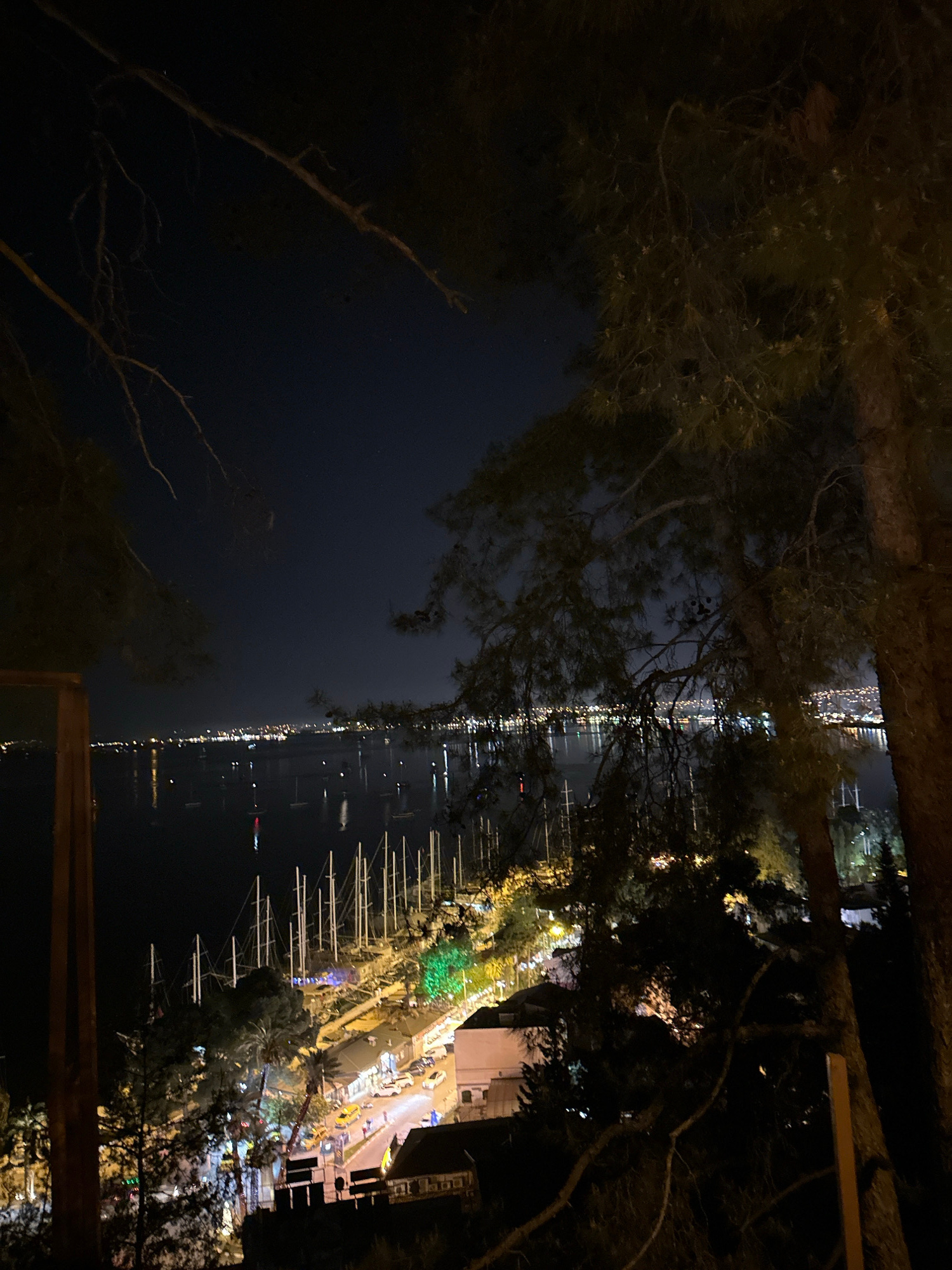 This nighttime view is of Fethiye, Turkey, as seen from an elevated, tree-filled vantage point, possibly a hillside or a park overlooking the harbor. The long expanse of water reflects the city lights…read more