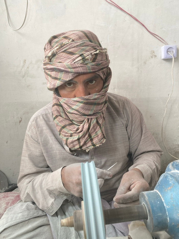 An adult male is observed in a workshop in Kandahar, Afghanistan, engaged in a manufacturing or crafting process. His face is largely obscured by a plaid head covering, revealing only his eyes, which…read more