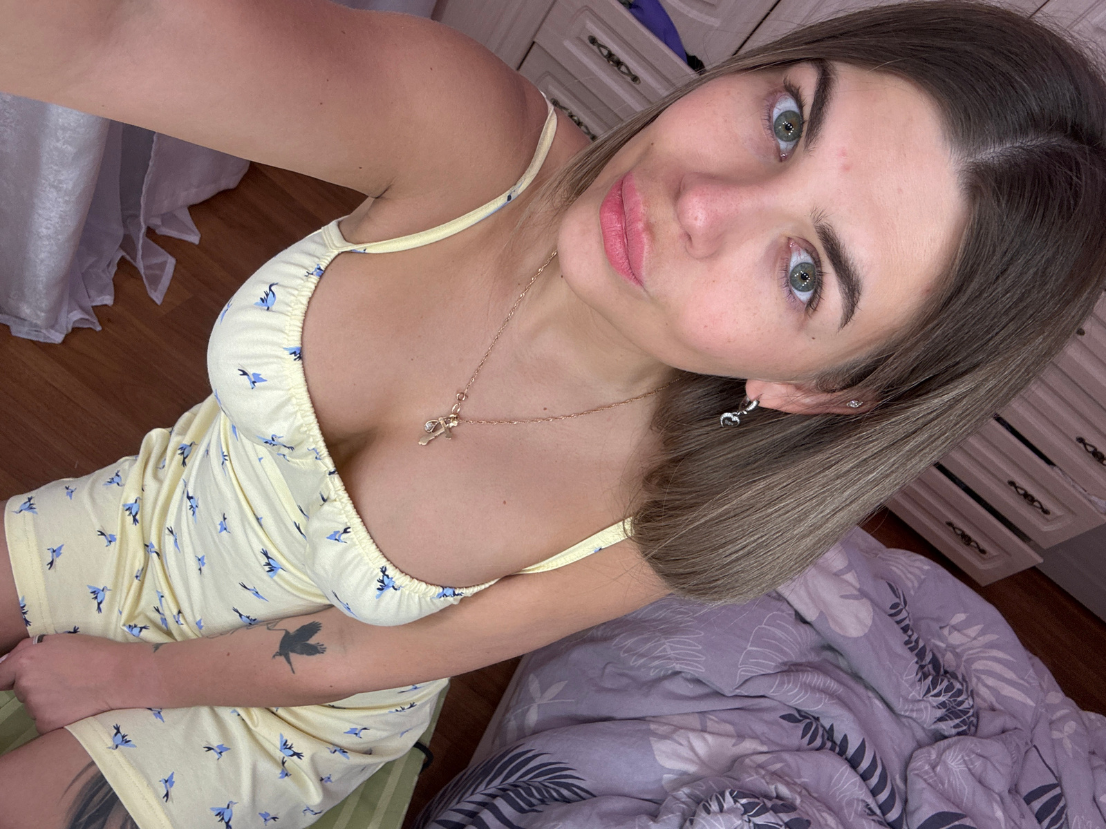 A woman with light brown hair and green eyes is lying down in a room. She is wearing a yellow dress with blue bird patterns and a gold necklace. There is a bird tattoo on her left arm. The room contai…read more