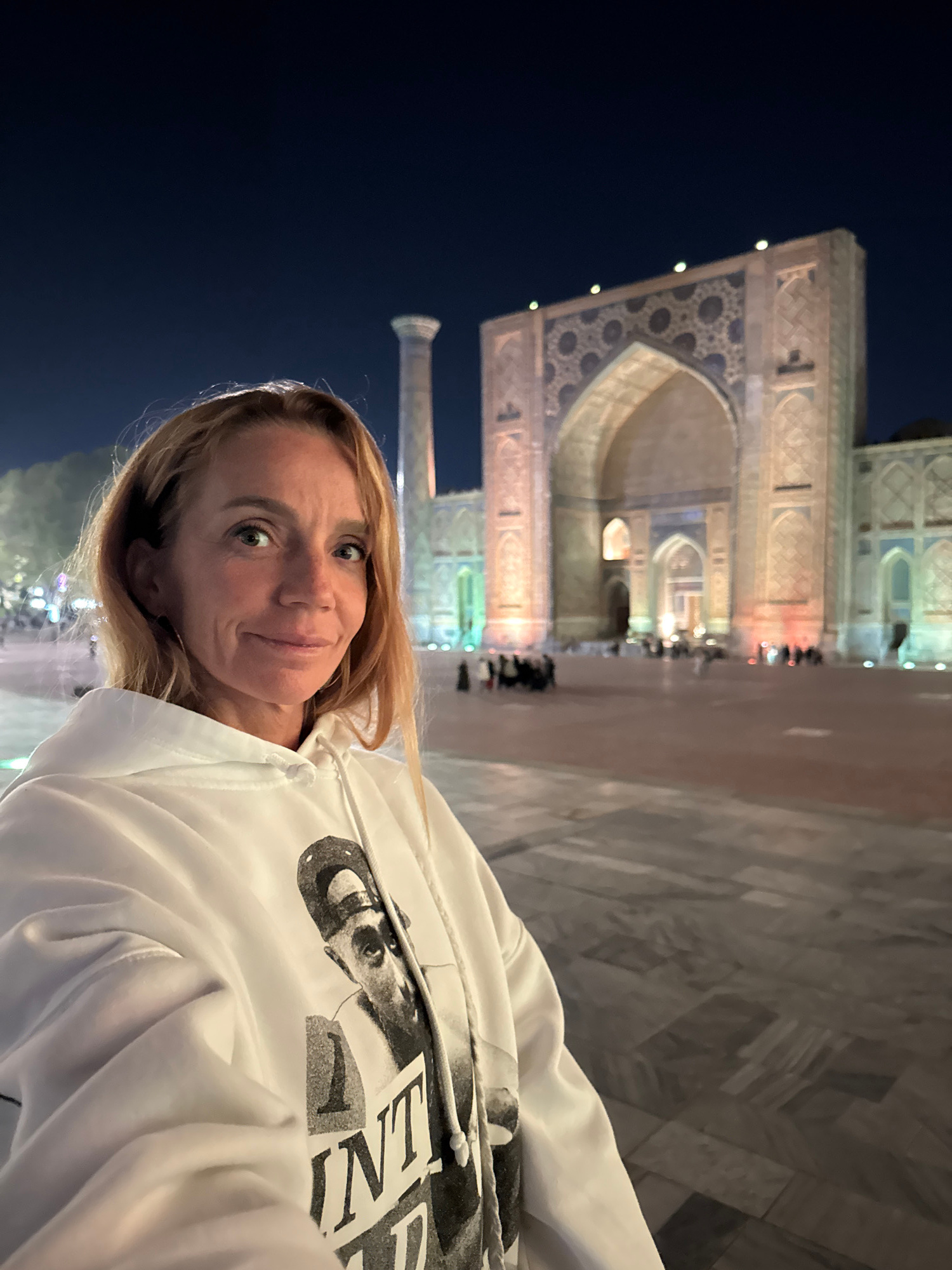 A selfie captures a woman with shoulder-length blonde hair and fair skin. She is wearing a white hoodie with a black graphic, positioned with the majority of her upper body visible in the frame. Behi…read more