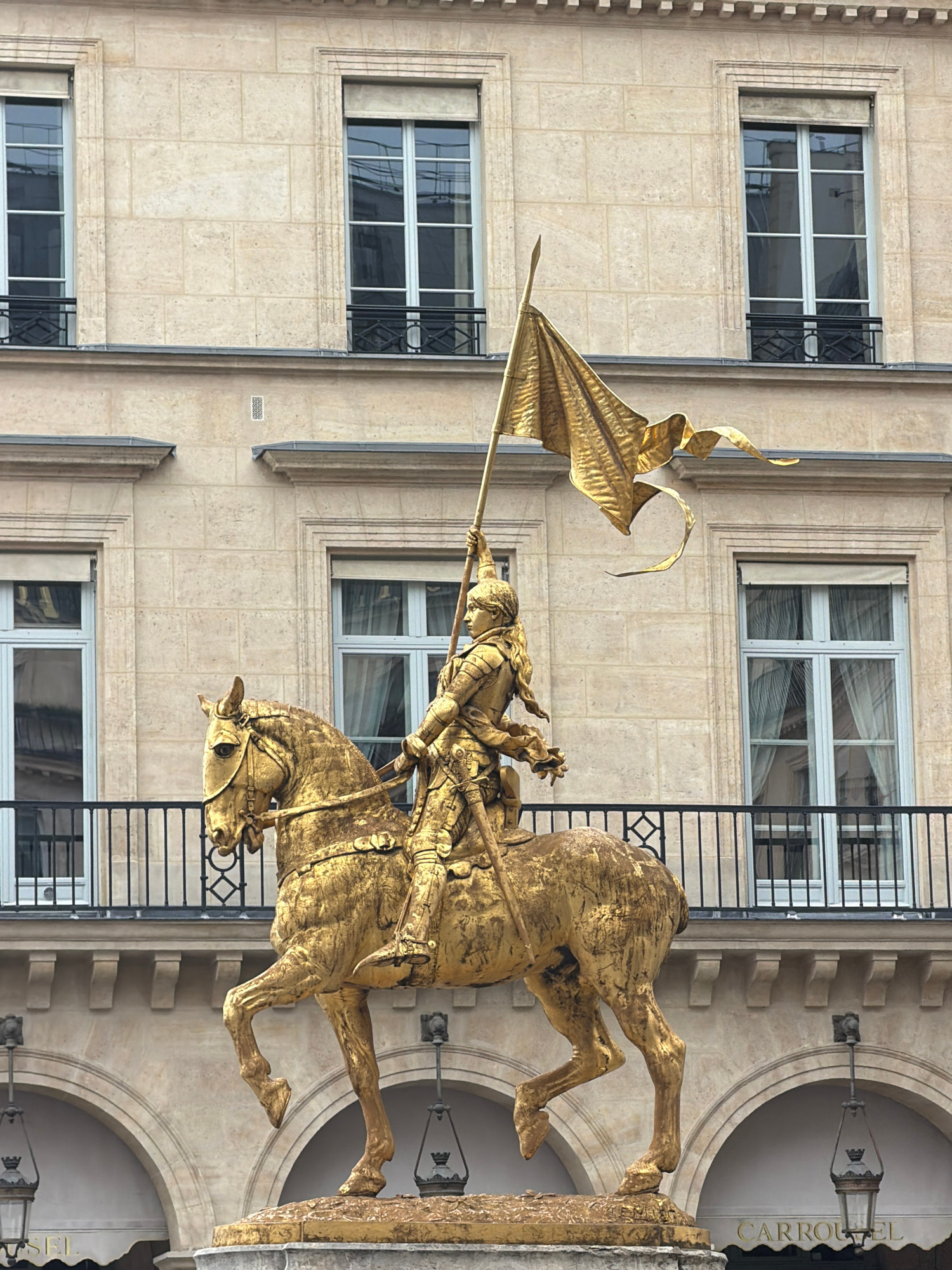 The image shows a gold statue of a knight on horseback, holding a flag, mounted on a building facade. The building is light-colored and has windows with black iron detailing. The statue is positioned…read more