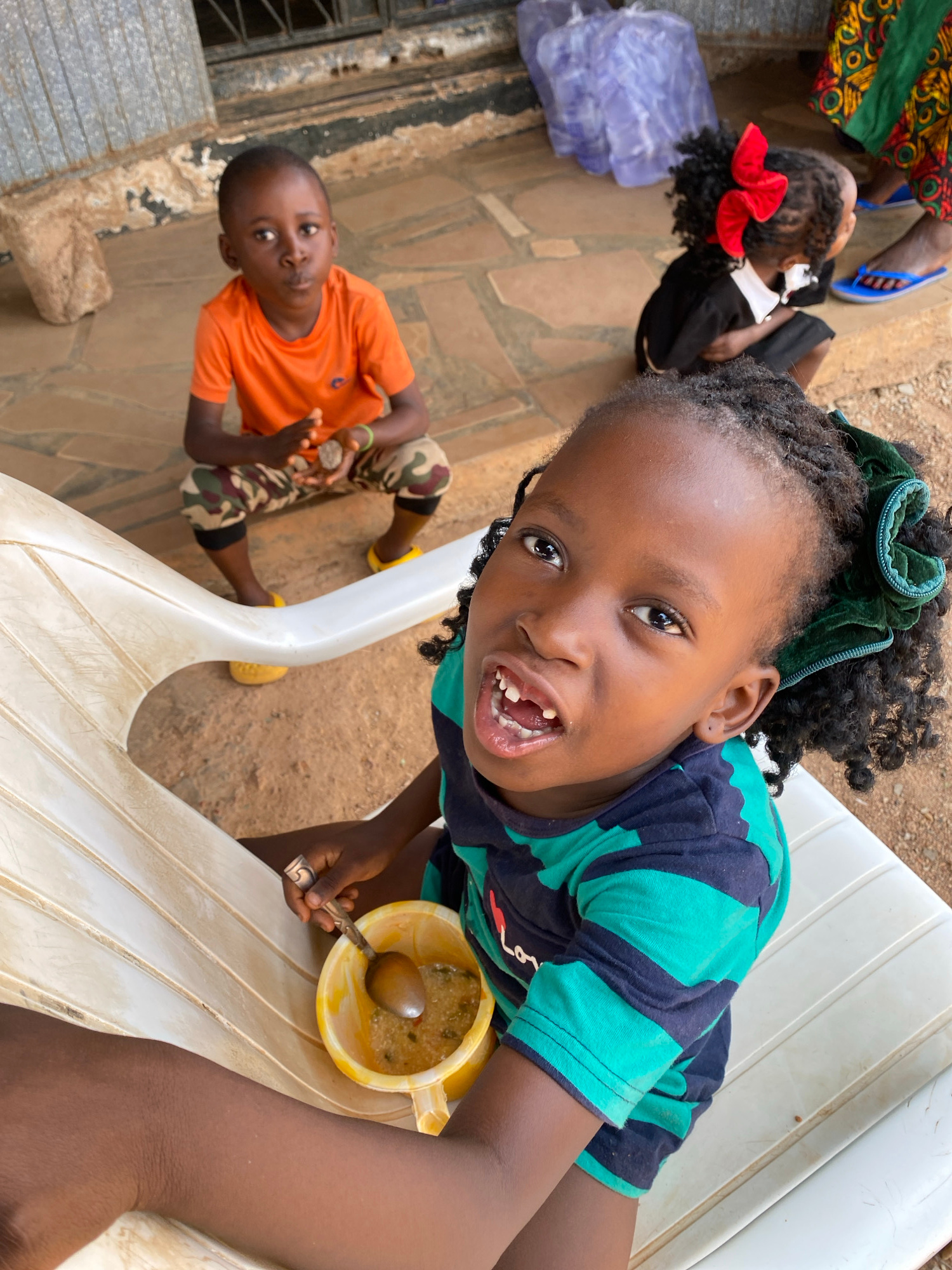 The image, taken in Kuru Karama, Nigeria, depicts a close-up, high-angle view of a young girl sitting on a white plastic chair. She wears a blue and green striped shirt and has a green scrunchie in he…read more