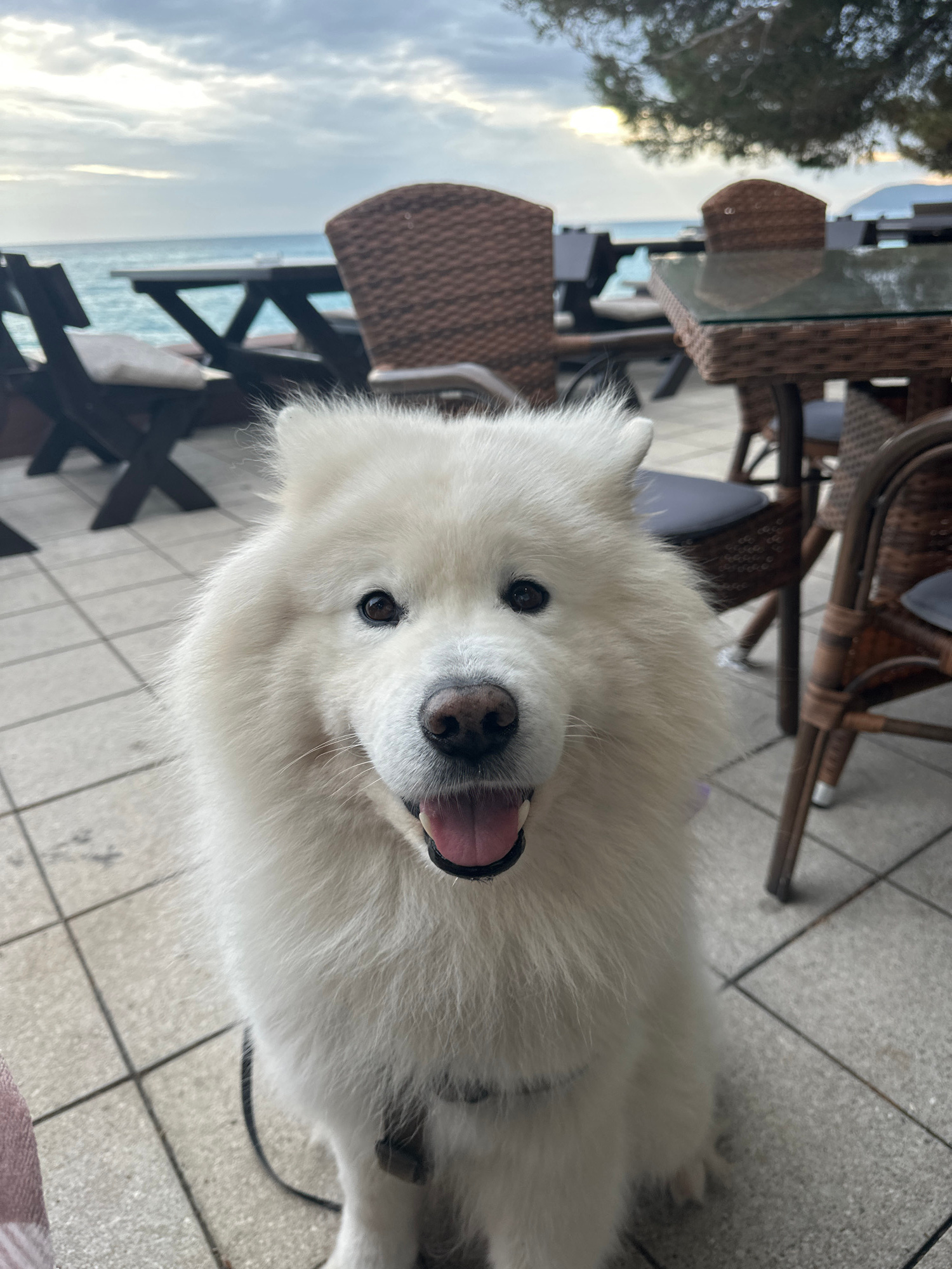 A close-up, tilted shot captures a fluffy white Samoyed dog on a tiled patio. The dog is facing the camera with its mouth open. In the background, there is a blurred view of a beach with a railing, ta…read more