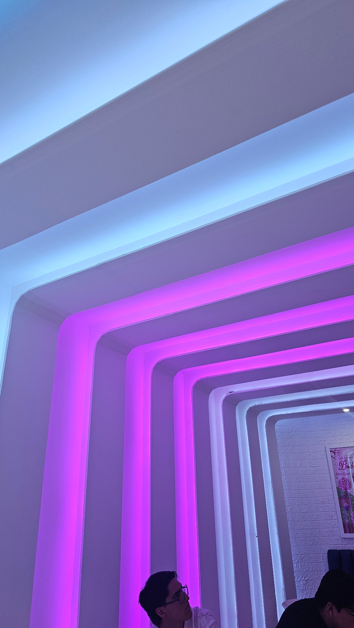 A view looking upward reveals a layered, illuminated structure. The layers are white, with alternating blue and pink lighting highlighting their edges. In the upper right corner, two individuals are vā¦read more