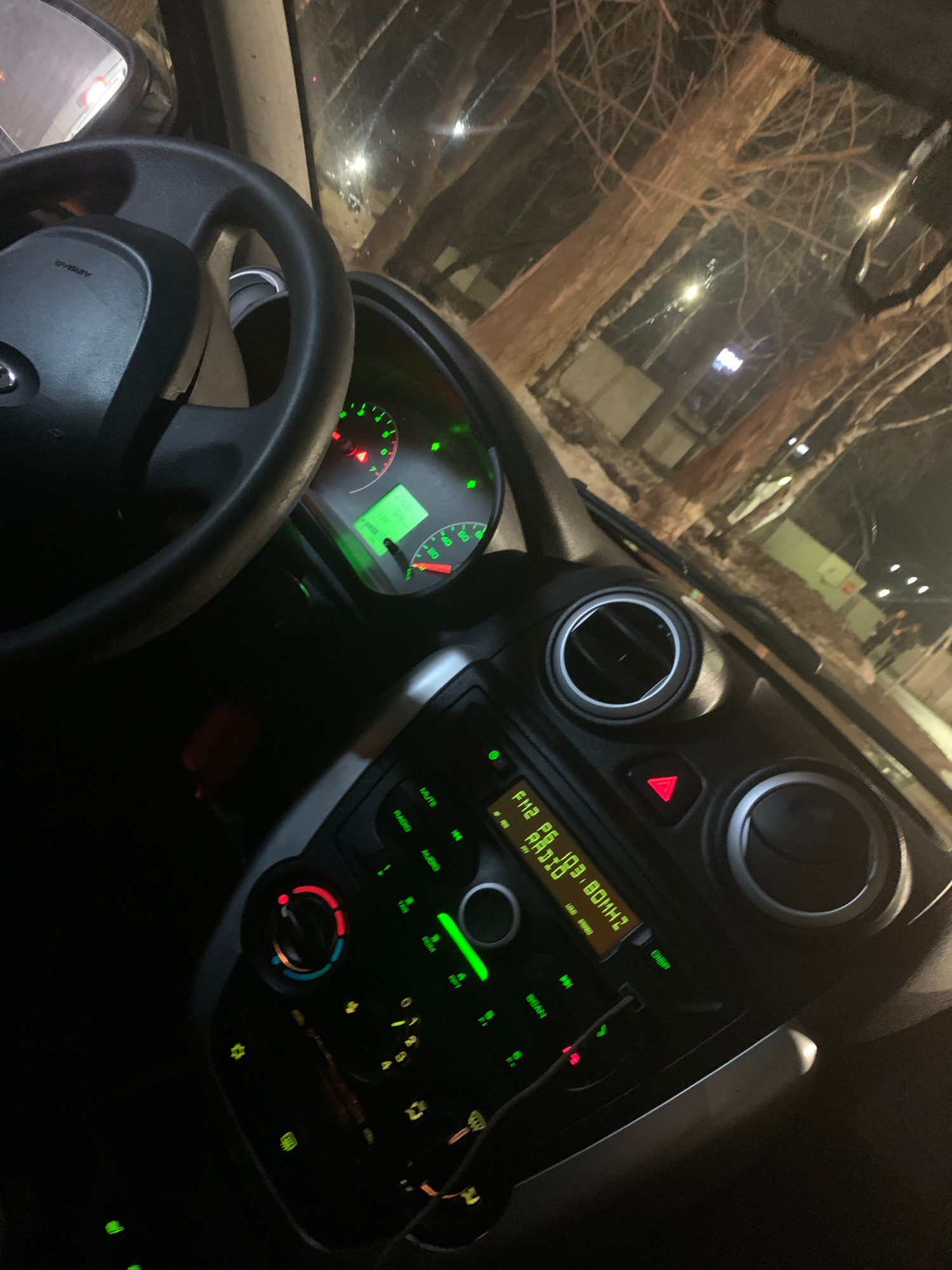 The image shows the interior of a car, focusing on the dashboard, steering wheel, and windshield view. The car appears to be stationary at night. Dashboard: The instrument panel is illuminated with g…read more