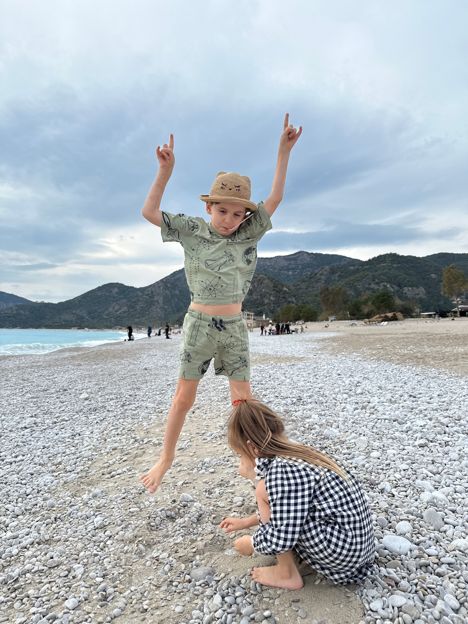 Two children are on a pebble beach in Fethiye, Turkey, with mountains and a cloudy sky in the background. One child, wearing a hat and a short-sleeved shirt and shorts printed with a space-themed desi…read more