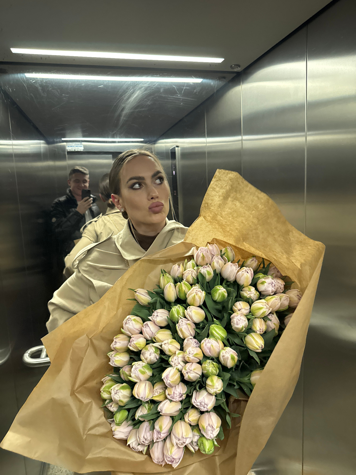 A person is standing in an elevator in Warsaw, Poland, holding a large bouquet of light pink and green tulips wrapped in brown paper. The walls and door of the elevator are made of a reflective materi…read more