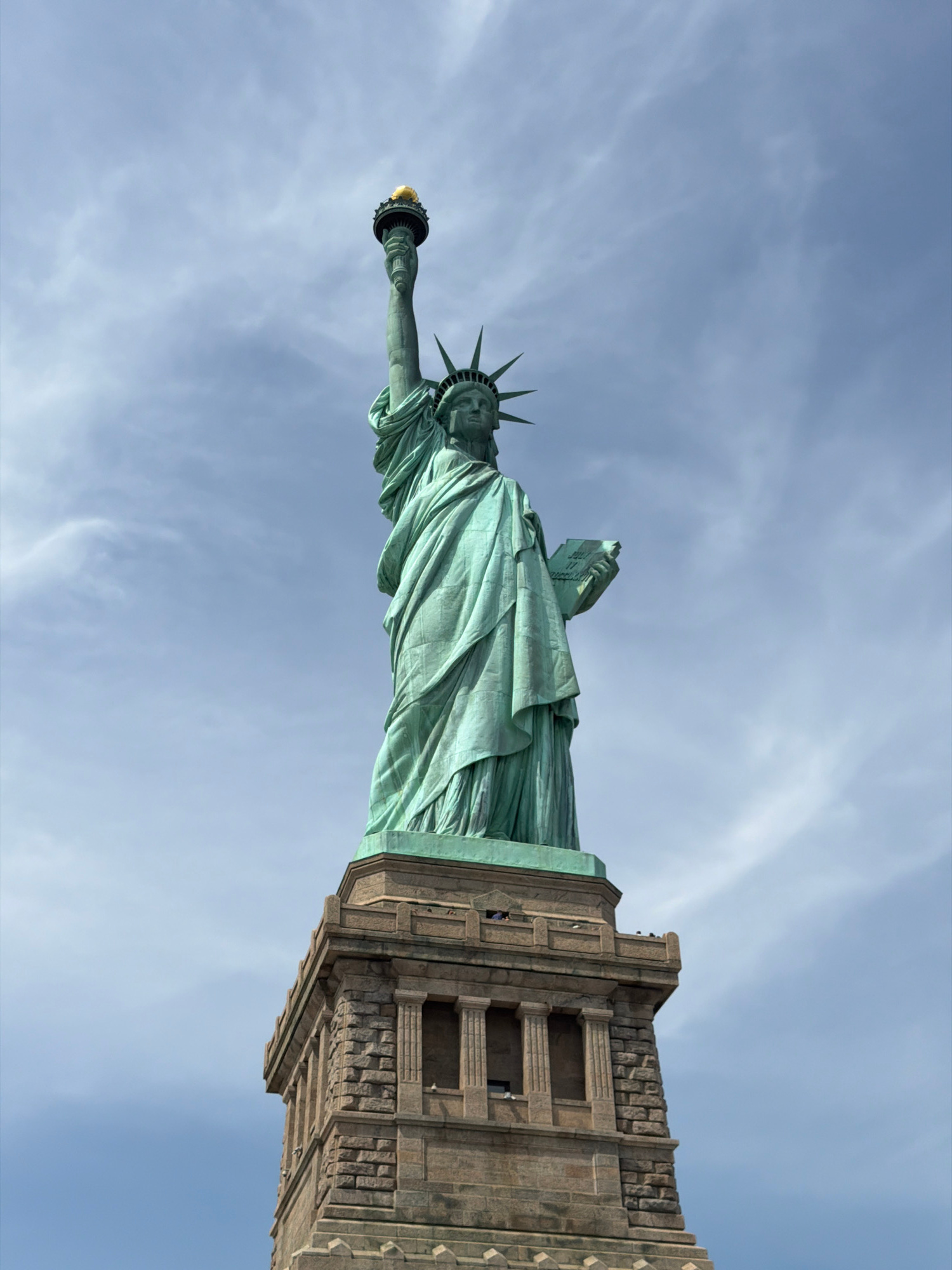 An outdoor, rotated vertical shot captures the iconic Statue of Liberty from an upward perspective against a sky filled with wispy clouds. The statue, depicting Libertas, the Roman goddess of liberty,…read more